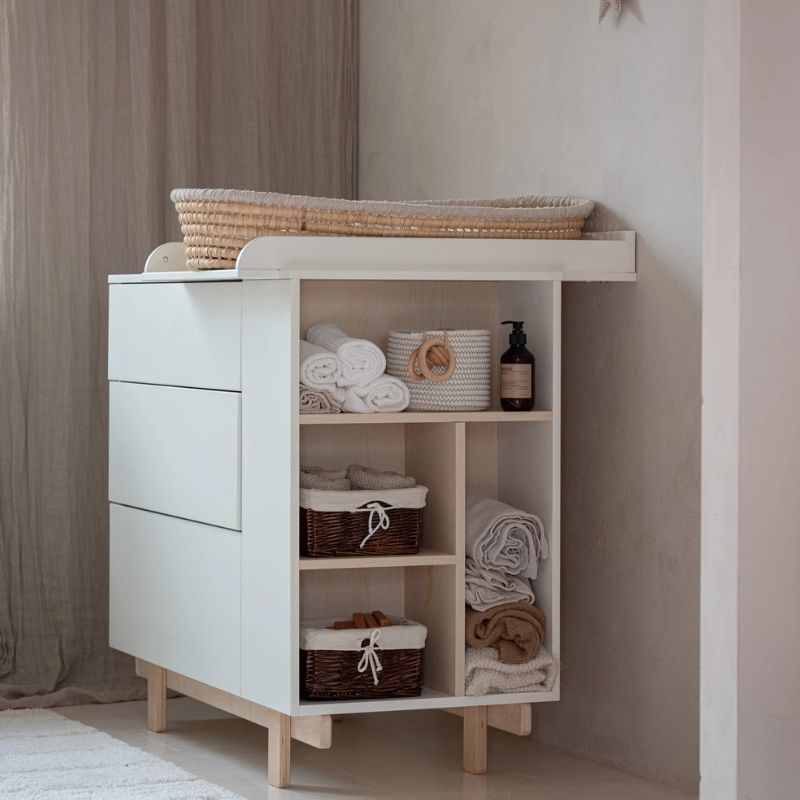 Do komody można dokupić przewijak, w formie nakładki na blat komody, który pozwala w wygodny sposób wykonać wszystkie czynności pielęgnacyjne przy dziecku. Aby umożliwić rodzicom dowolną aranżację przestrzeni na komodzie wprowadzone zostały 2 regulacje montażu nakładki. Może on znajdować się na środku lub po lewej stronie blatu.