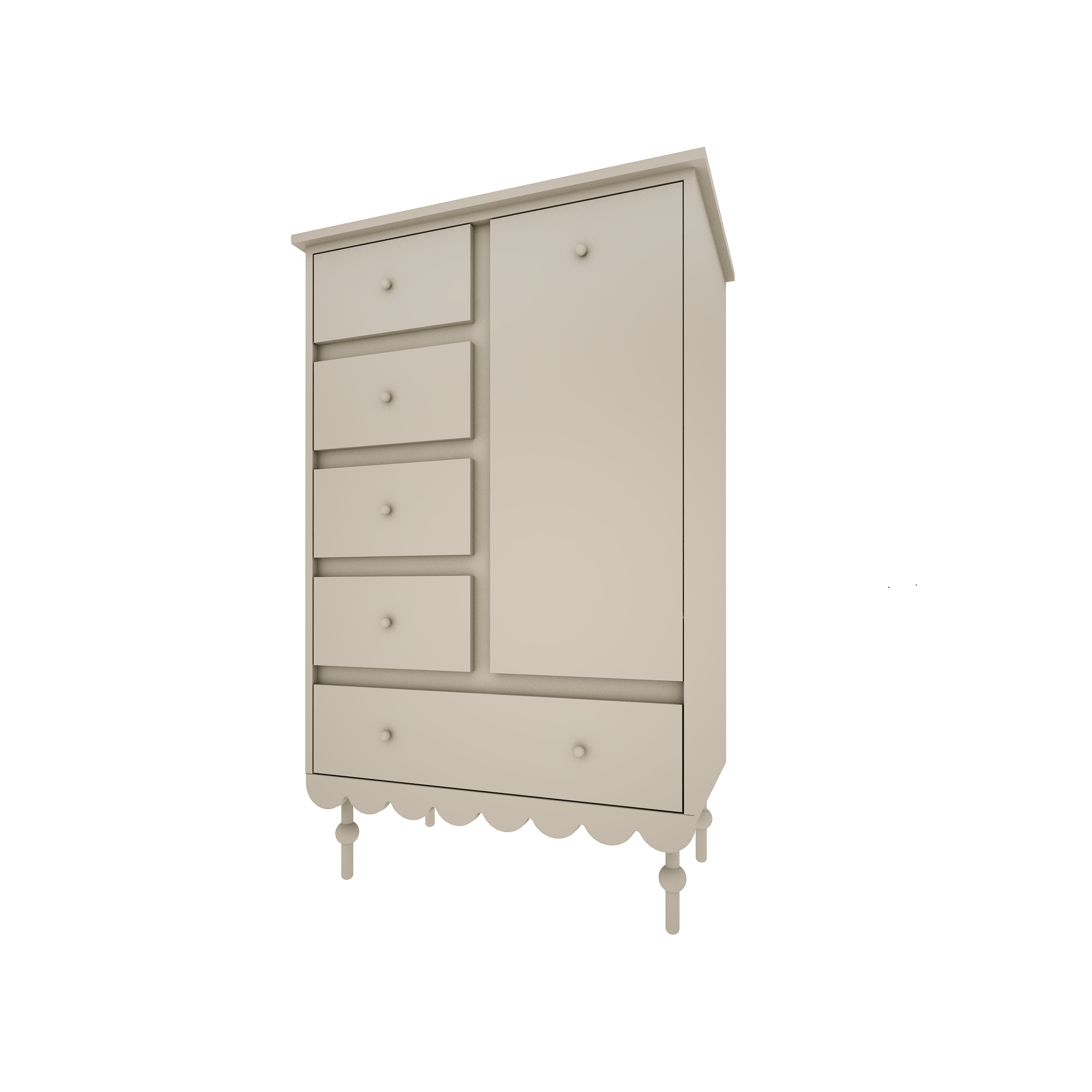 Komoda Babushka wysoka to wyjątkowy mebel, który zachwyca retro charakterem, dzięki pięknie toczonym nóżkom z litego buku. Dekoracyjny element w postaci falbanki dodaje jej niesamowitego, dziewczęcego uroku.