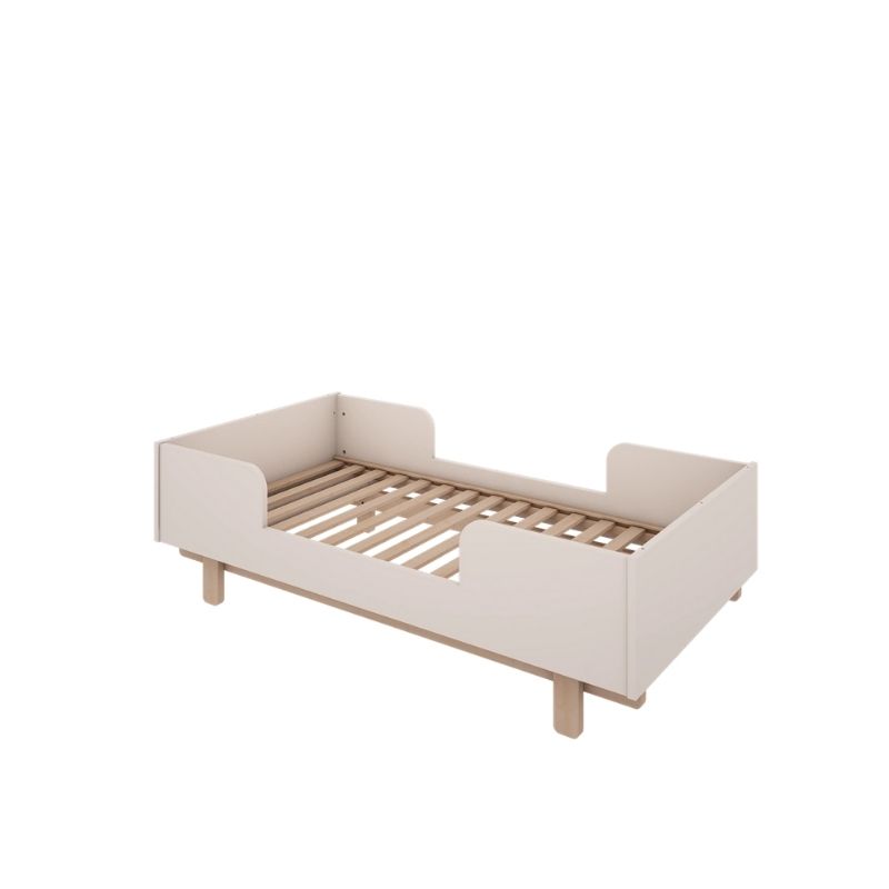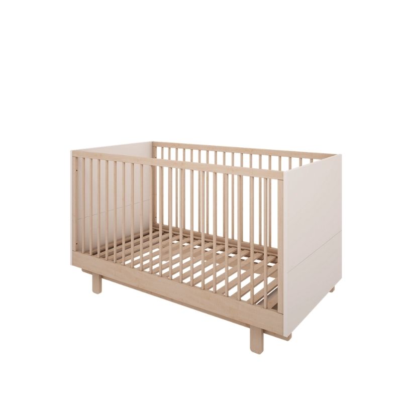 Klasyczne łóżeczko niemowlęce 140x70 cm wykonane z płyty meblowej w kolorze złamanej bieli z dodatkiem naturalnego drewna. Łóżeczko dziecięce Basic posiada 3 poziomy regulacji materaca, dodatkowo jedna z ramek bocznych posiada 3 wyjmowane szczebelki, aby umożliwić już starszemu dziecku samodzielne wychodzenie z łóżeczka.