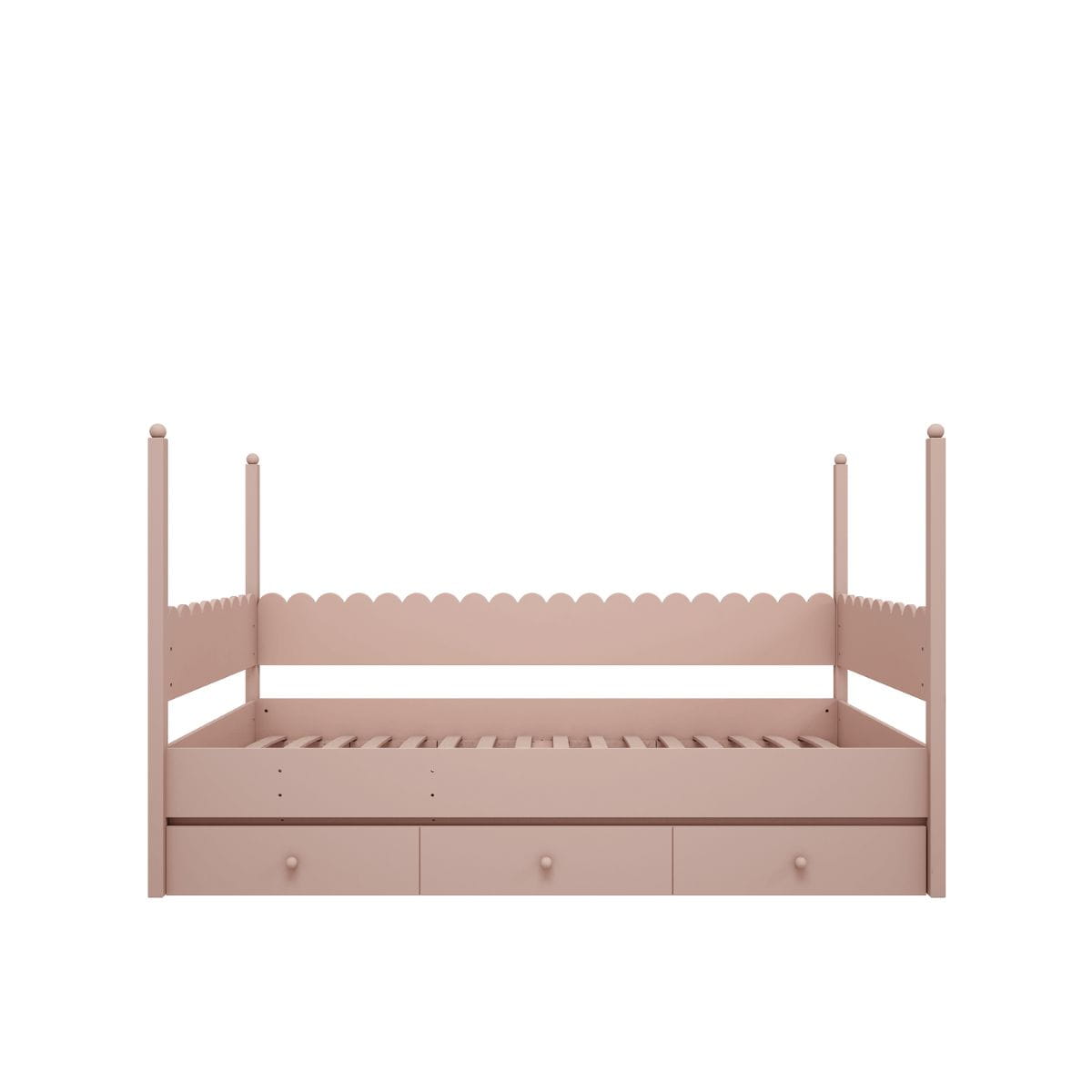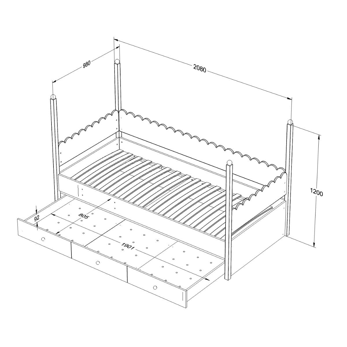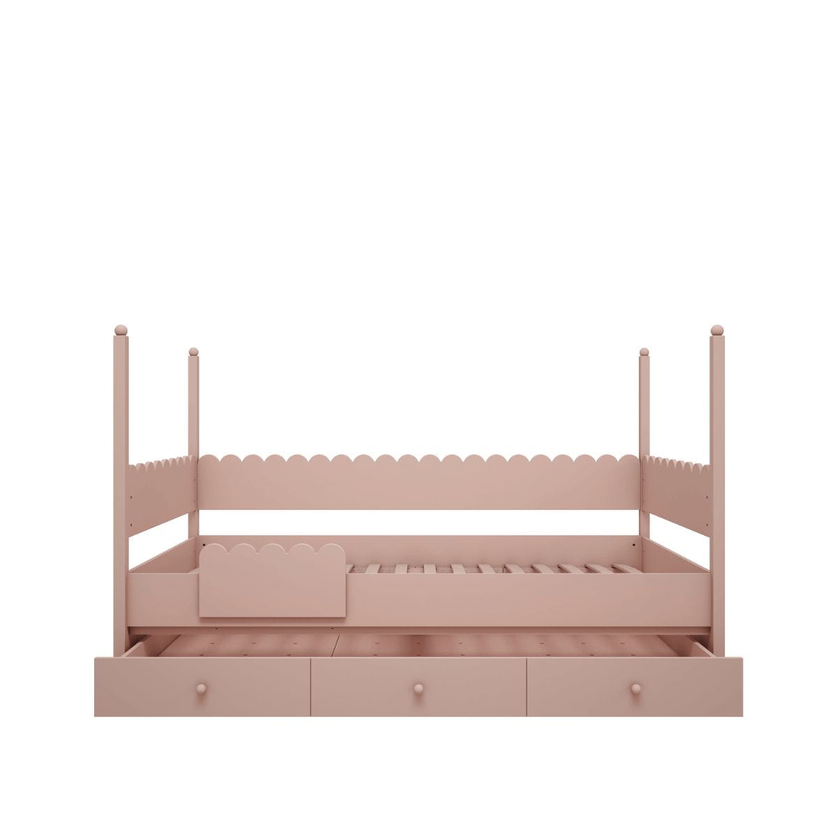Dodatkową zaletą łóżka jest pojemna szuflada, która oferuje dwa praktyczne rozwiązania: może służyć jako przestrzeń do przechowywania pościeli, zabawek lub ubrań albo jako wysuwane, dodatkowe łóżko – idealne na wizyty małych gości lub do codziennego użytku jako trzecie miejsce do spania.