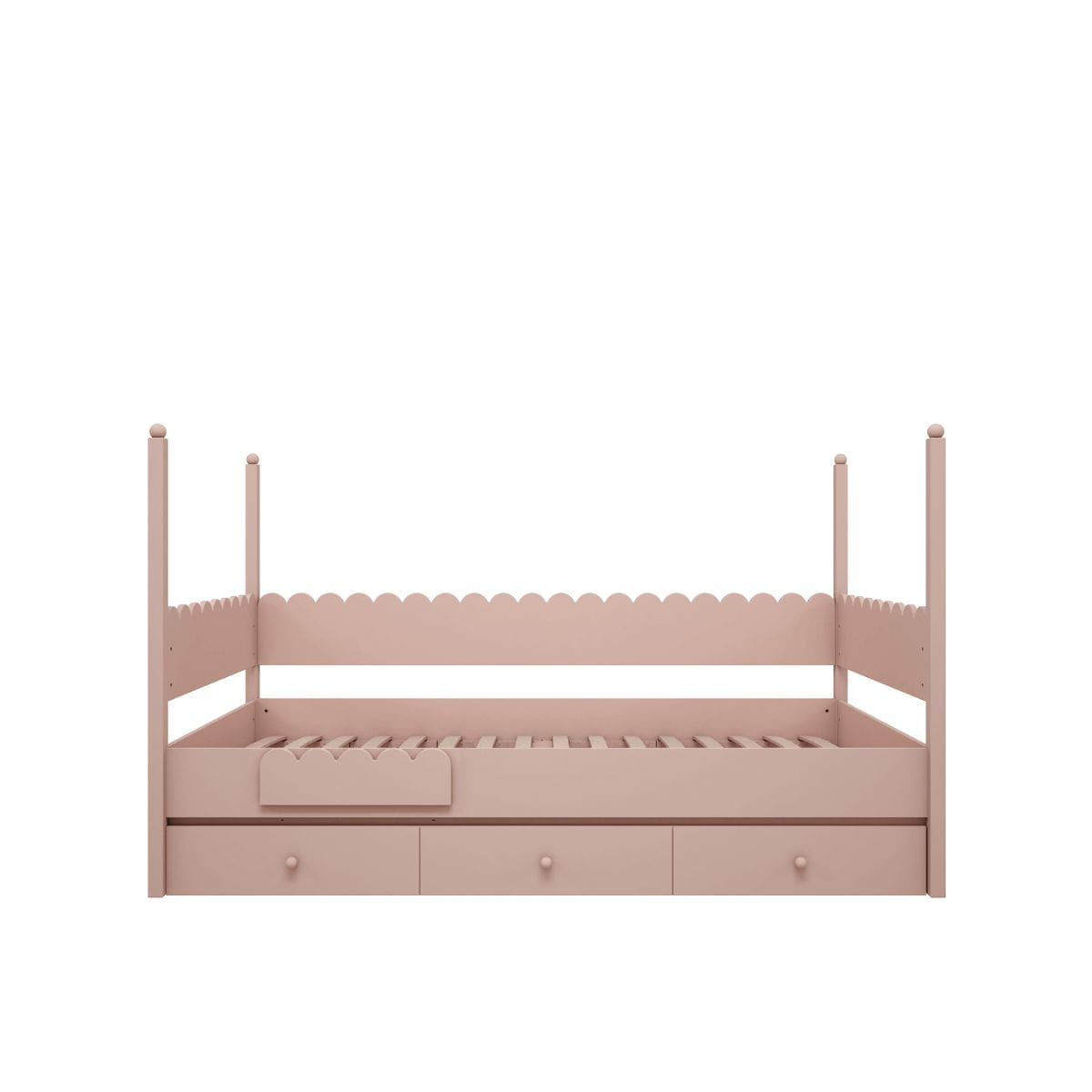 Urocza barierka w kształcie chmurki to nie tylko element zabezpieczający dolne łóżko piętrowe, ale także estetyczna maskownica, gdy łóżko wykorzystywane jest jako samodzielny mebel. To idealne rozwiązanie dla rodziców, którzy cenią zarówno bezpieczeństwo, jak i spójny wygląd wnętrza. Barierka nawiązuje do bajkowego stylu kultowej kolekcji Babushka – jej zaokrąglony kształt i subtelne wzornictwo doskonale komponują się z resztą mebli, wprowadzając do pokoju dziecka przytulny i sielski klimat.