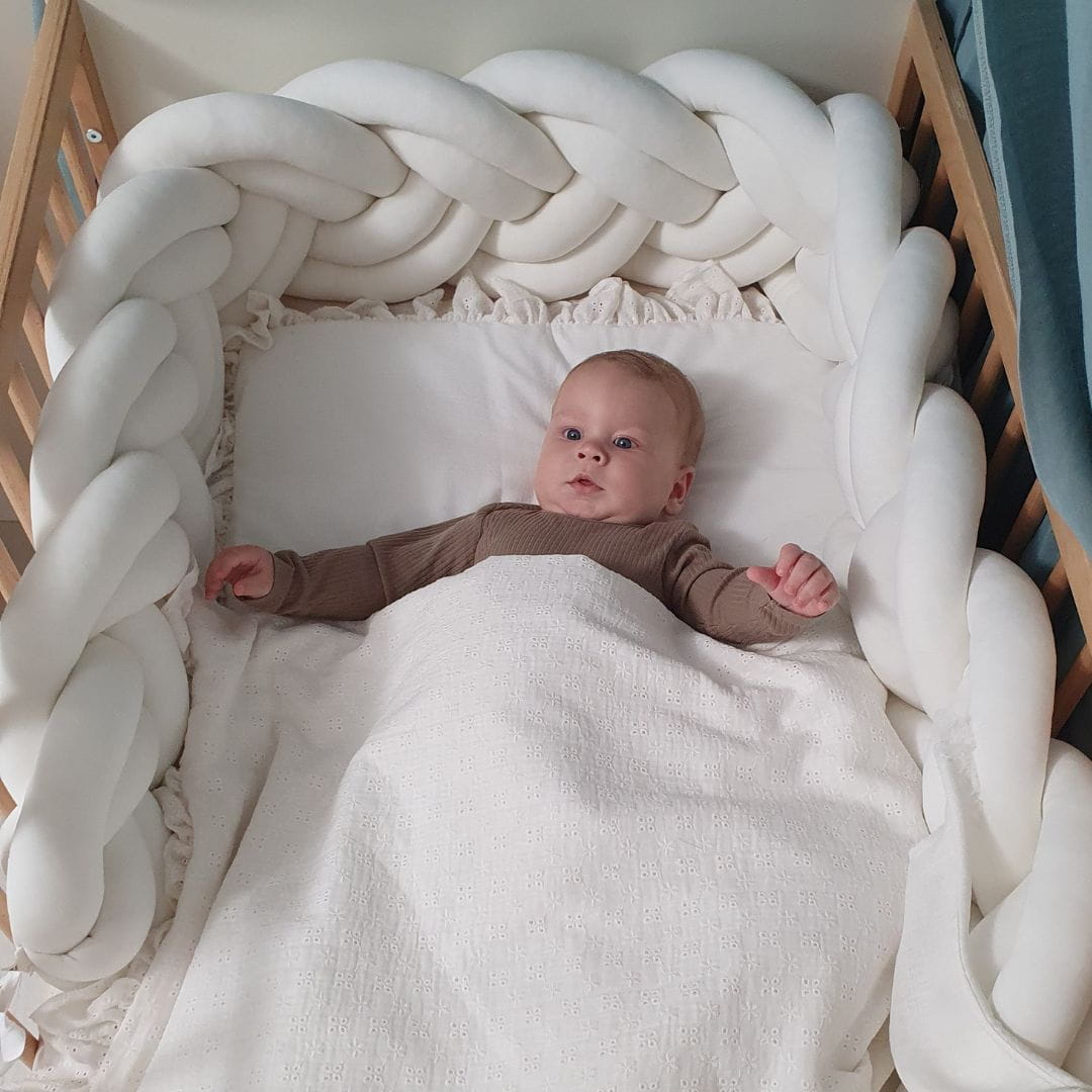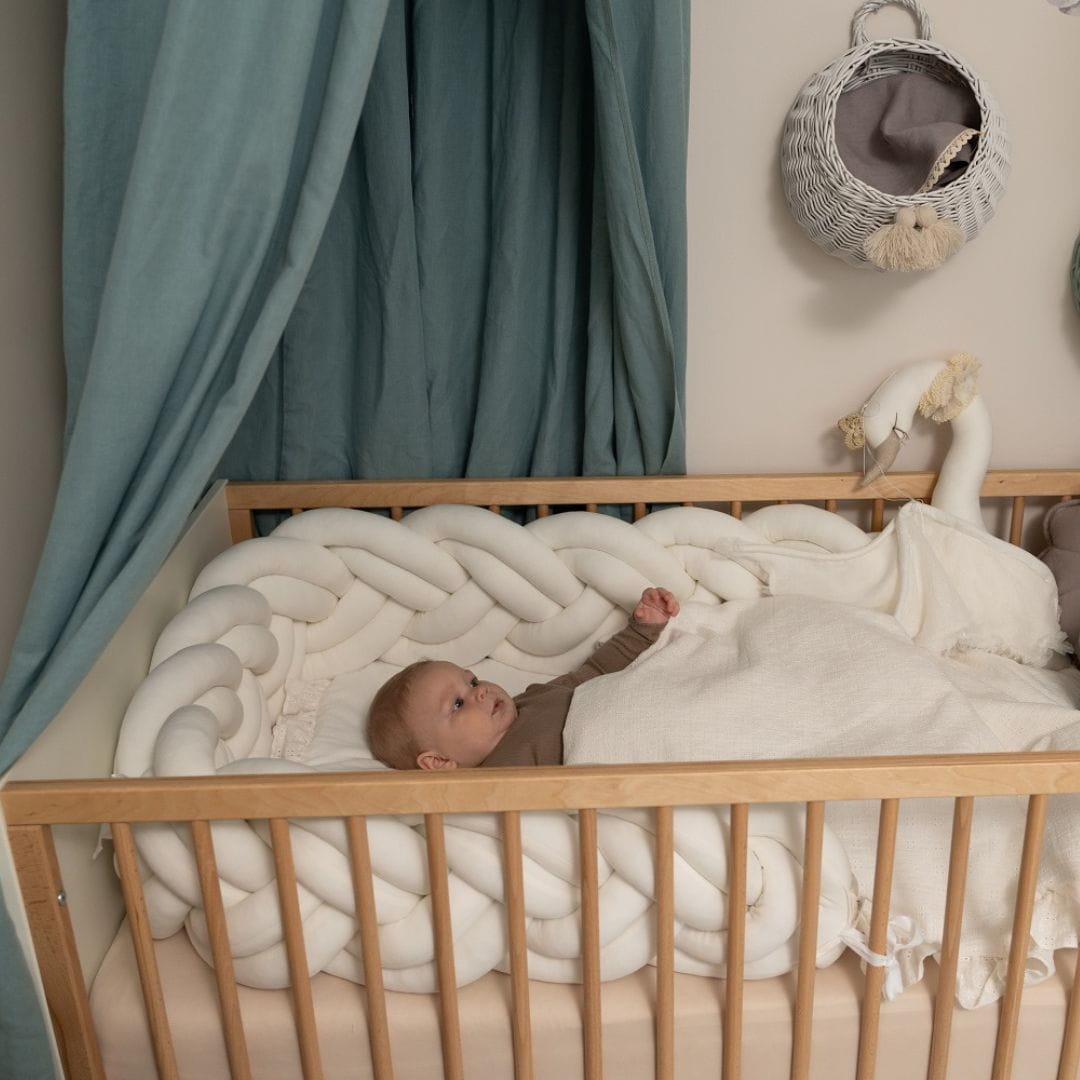 Gładki wzór tkaniny i ciekawa faktura plecionego ochraniacza do łóżeczka stanowi idealne połączenie.