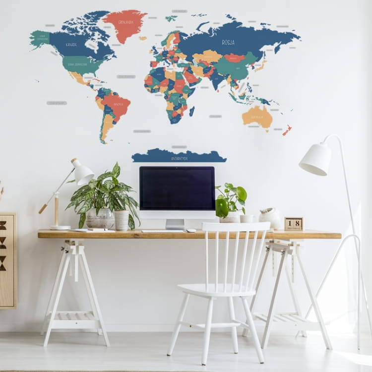 Naklejka Mapa świata to idealne rozwiązanie dla miłośnika podróży z duszą odkrywcy :) Naklejka na ścianę dla dzieci jest niezwykle kolorowa, ale nie pstrokata - nadaje się zarówno do aranżacji pokoju przedszkolaka jak i starszego dziecka.