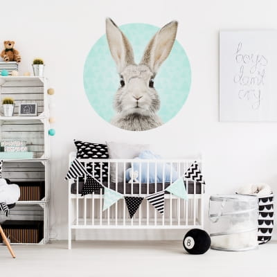 Naklejka na ścianę do pokoju dziecka z motywem uroczego królika na kolorowym tle pomoże Ci w szybki sposób przeprowadzić metamorfozę wnętrza. To stosunkowo niedrogie i proste rozwiązanie na widoczną zmianę wizerunkową w dziecięcym pokoju.