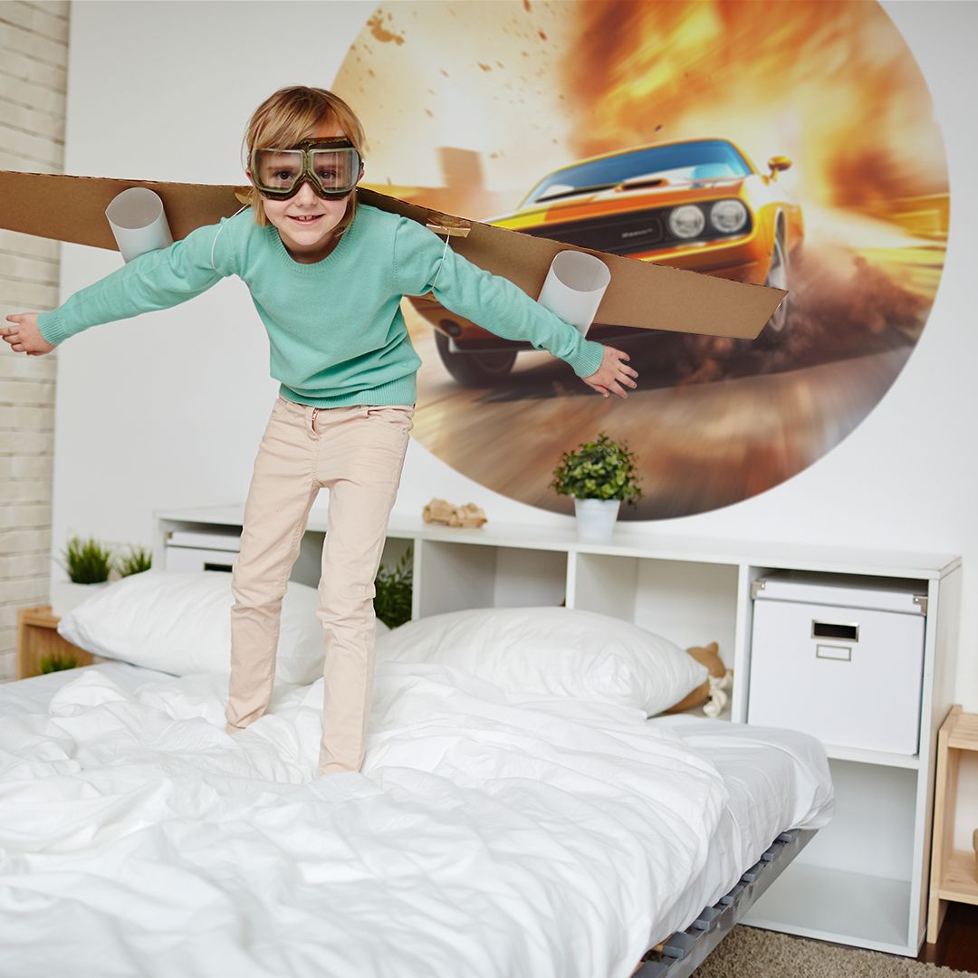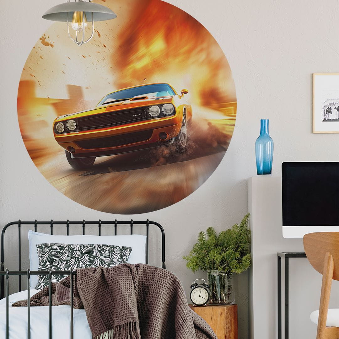 Koło z tapety samoprzylepnej z motywem samochodu to doskonały wybór do pokoju pasjonatów motoryzacji.