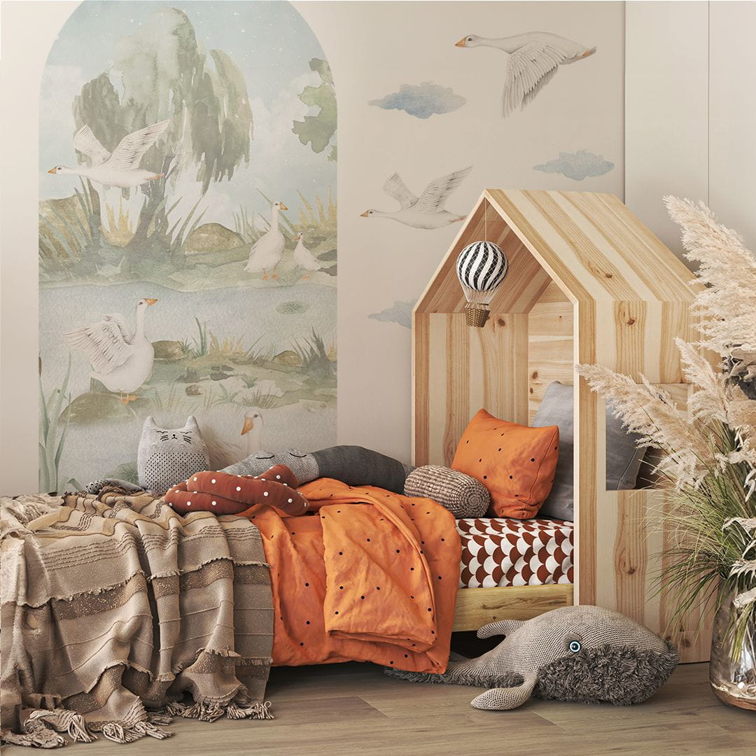 Naklejka na ścianę z motywem gąsek to wyjątkowa i urocza dekoracja, która wprowadza sielski klimat do pokoju dziecka. Idealnie nadaje się do stworzenia przytulnego kącika dla niemowlaka, dodając wnętrzu subtelnego uroku i harmonii. Motyw gąsek, symbolizujący spokój, naturę i ciepło rodzinne, tworzy atmosferę, która sprzyja wyciszeniu i relaksowi.