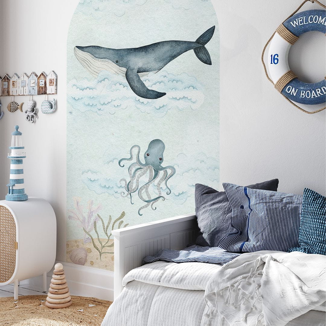 Łuk z tapety samoprzylepnej z motywem wielorybów to idealna dekoracja do pokoju dziecięcego, która świetnie prezentuje się zarówno solo jak i w towarzystwie innych produktów z kolekcji Głębia Oceanu. Zakładaj strój nurka i zanurz się w wodach pełnych różnorodnych ryb, ssaków wodnych i innych morskich stworzeń. Odkryj fascynujący świat podwodnych przygód i ciesz się niepowtarzalnym morskimi krajobrazami w swoim pokoju!