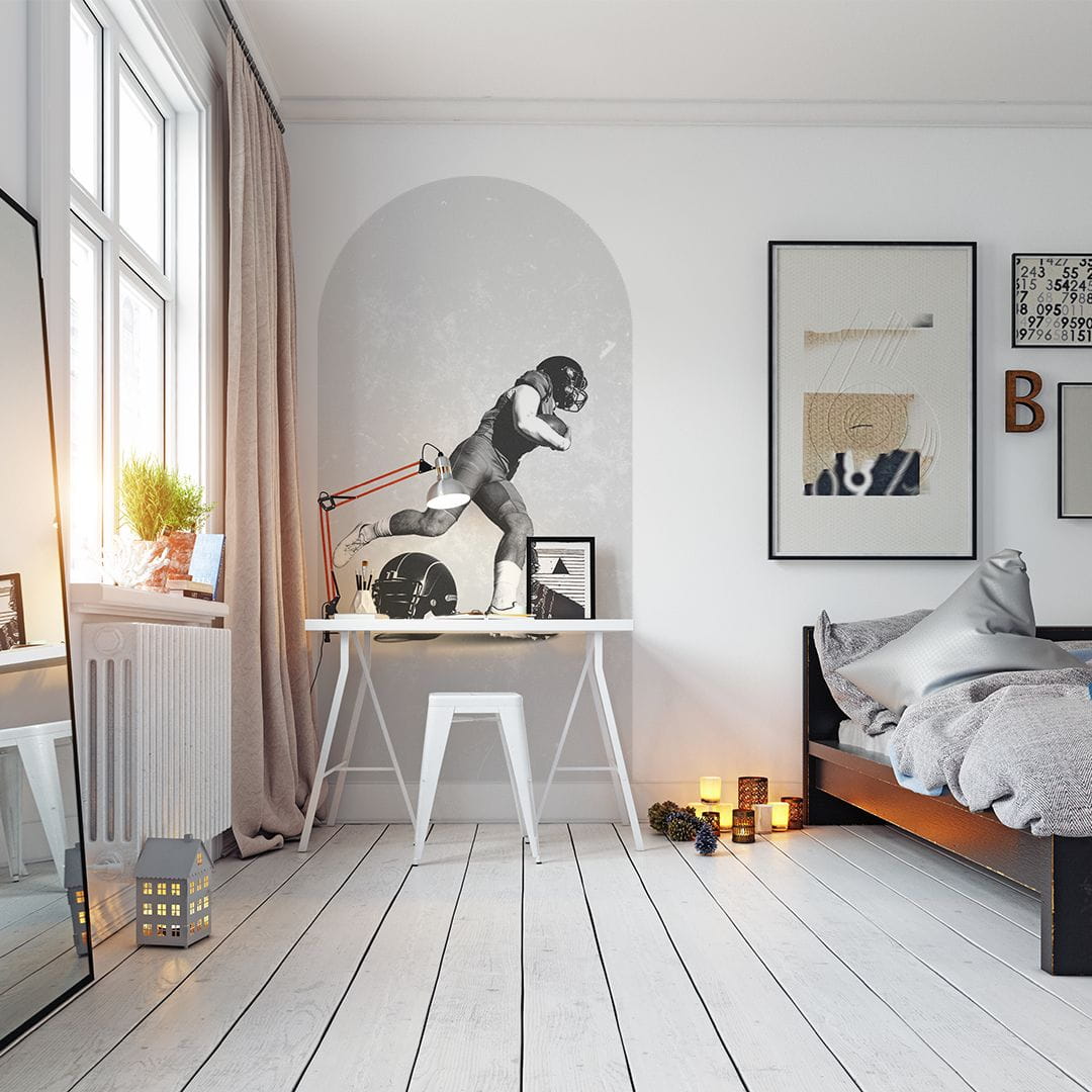 Łuk z tapety samoprzylepnej z motywem sportu to świetny wybór do pokoju nastolatka, sypialni lub salonu. Jej dynamiczny design doda wnętrzu nowoczesnego i energetycznego charakteru.