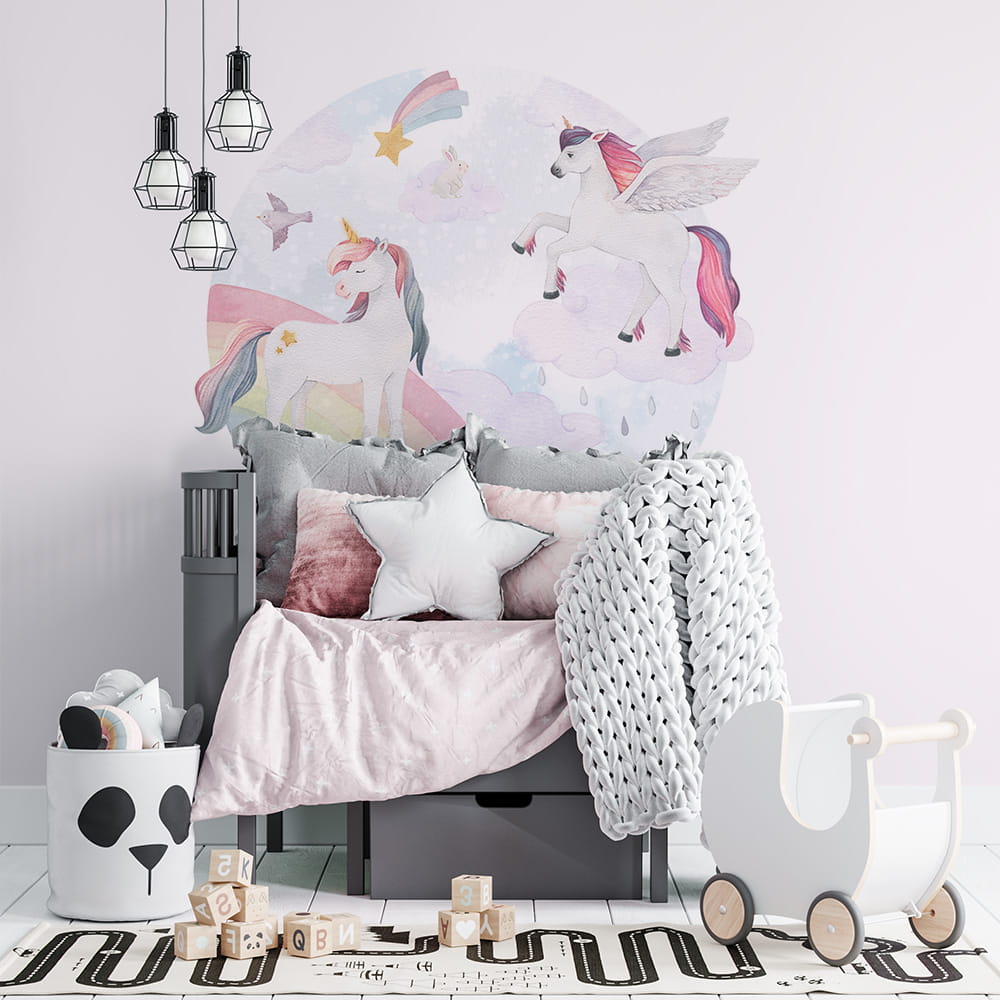 Naklejka załóżkownik Jednorożec i Pegaz to magiczna kompozycja, w tle której wyróżnimy tęczę, chmury, gwiazdę, ptaszka, a także białego królika.