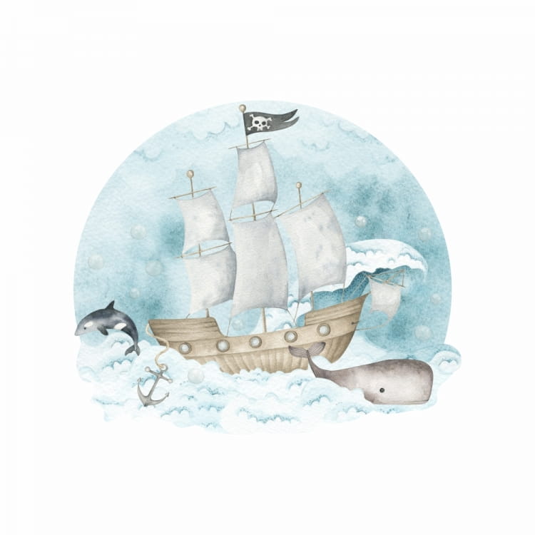 Drukowana naklejka na ścianę do pokoju dziecięcego ze statkiem pirackim pokryta jest laminatem, dzięki czemu jest odporna na zabrudzenia.