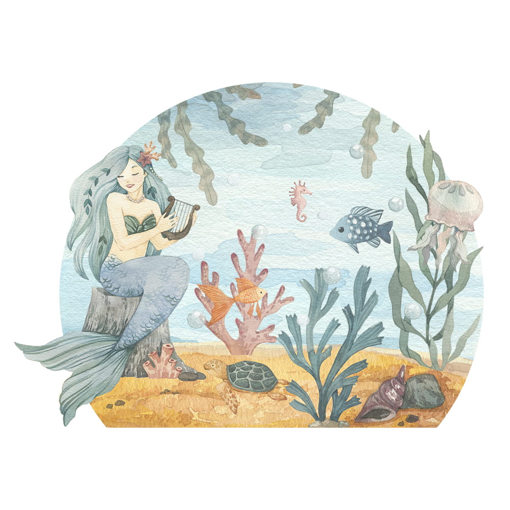 Naklejka Załóżkownik Syrena przedstawia podwodny krajobraz. Miks roślinności i zwierząt wodnych w towarzystwie bajkowej Syreny. Całość utrzymana w subtelnych kolorach.