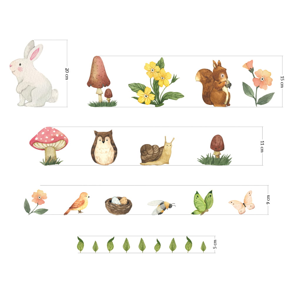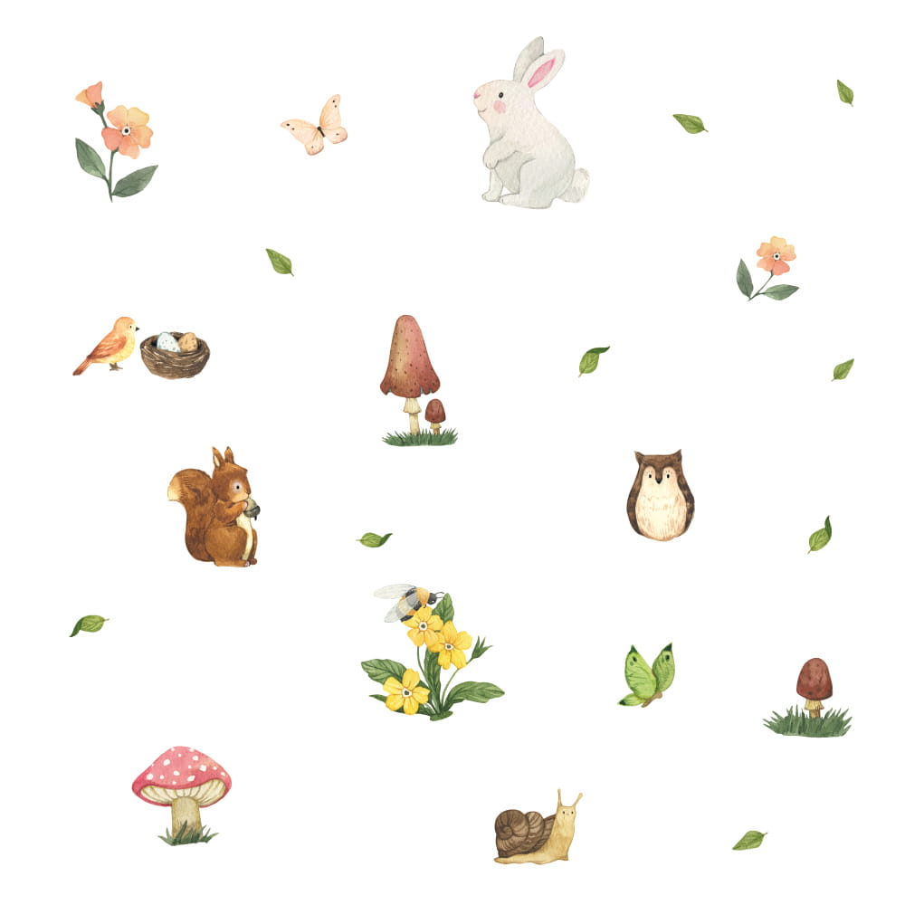 Zestaw naklejek na ścianę do pokoju dziecka zawiera: królika, grzyby, kwiatki, listki, wiewiórkę, sowę, ptaszka, motyle, pszczołę oraz ślimaka.