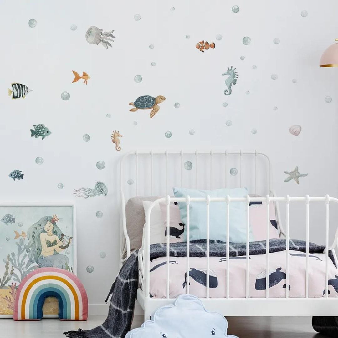 Zestaw naklejek na ścianę do pokoju dziecka zawiera: meduzy, żółwia, koniki morskie, ryby, bąble.