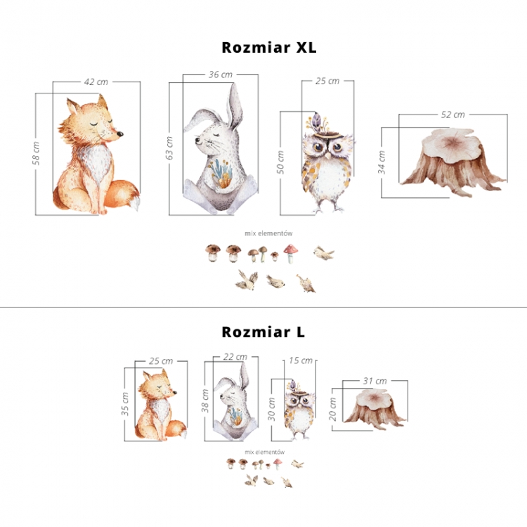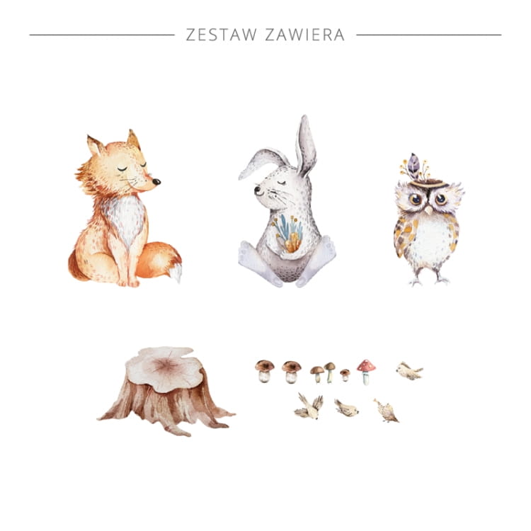 W zestawie naklejek ściennych znajdziesz lisa, sowę, zająca oraz pieniek i kilka ptaszków oraz grzybków.