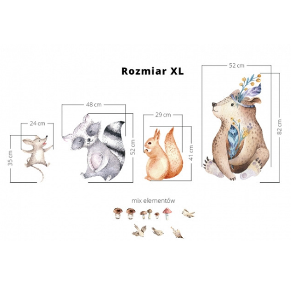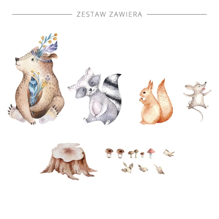 W zestawie naklejek na ścianę znajdziesz misia, szopa, mysz oraz wiewiórkę. Zobacz jak pięknie będą się prezentować z innymi naklejkami z serii Leśni Przyjaciele!