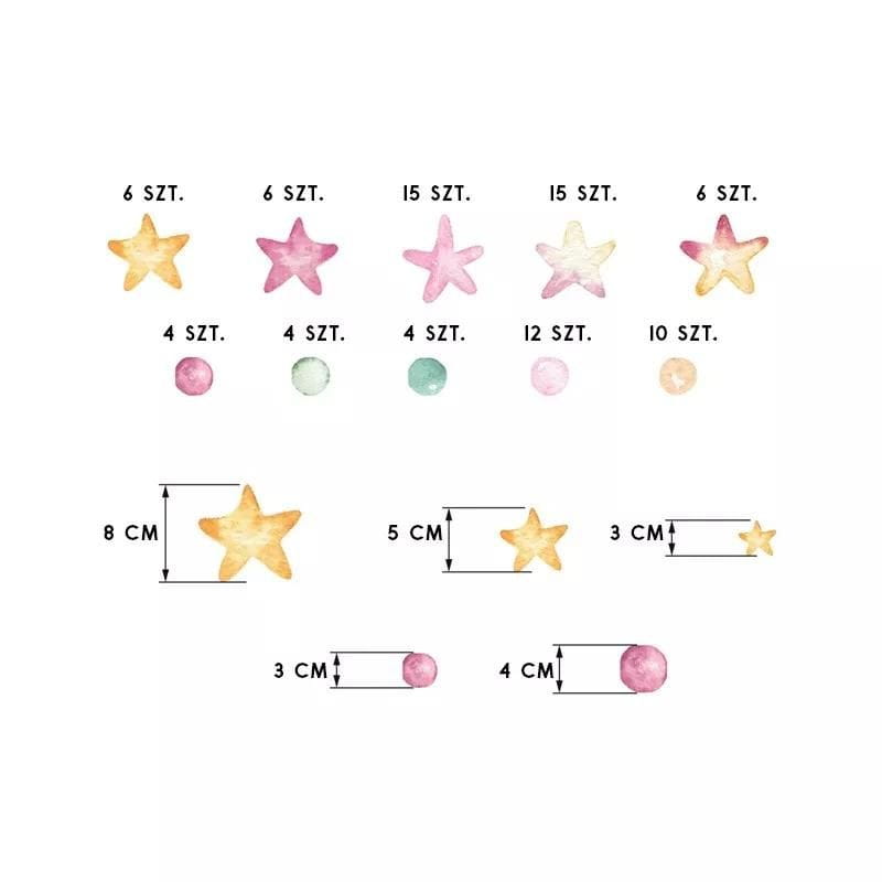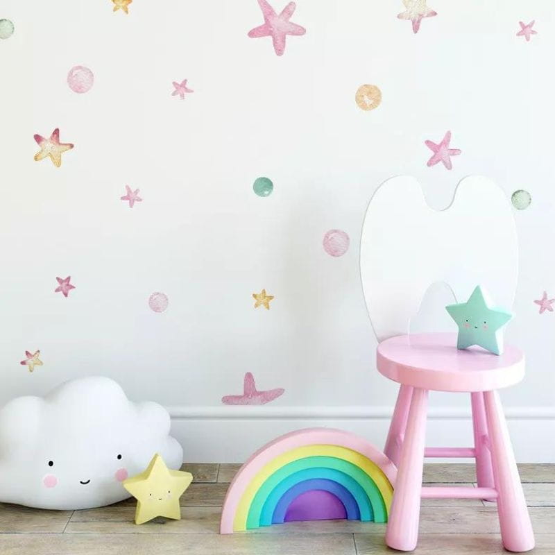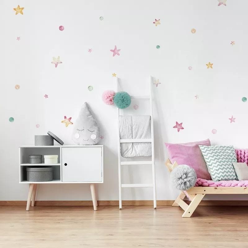 Naklejki na ścianę Gwiazdki i groszki w pięknych pastelowych odcieniach i unikalnym stylu watercolor dodadzą uroku i ożywią pokoik Twojego maluszka. To nie tylko niskobudżetowy projekt, ale również oryginalny sposób na widoczną zmianę wizerunkową pokoju dziecka.