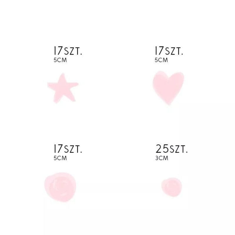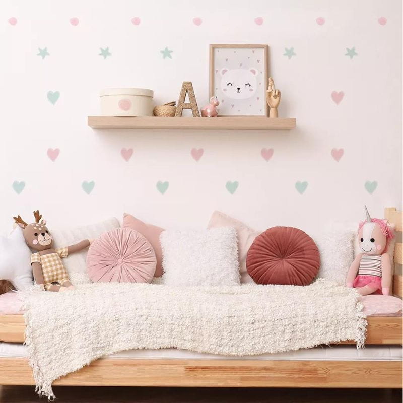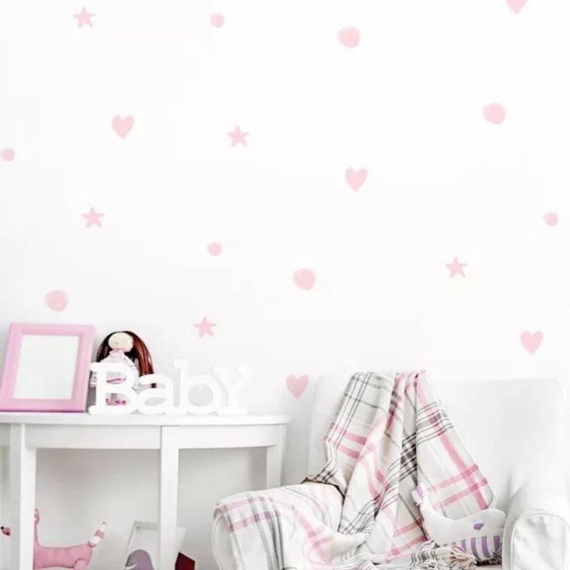 Naklejki na ścianę pastelowe gwiazdki, groszki oraz serduszka świetnie pasują do pokoju dziewczynki.