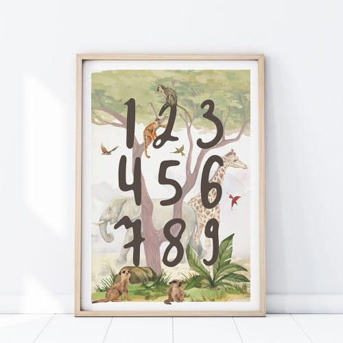 Plakat edukacyjny z cyframi w przyjazny sposób wprowadzi Twoje dziecko w świat cyfr. Oprócz waloru edukacyjnego, to także nietuzinkowa dekoracja w pokoju dziecka z motywem safari.