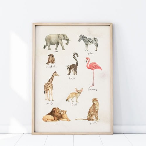 Plakat na ścianę Zwierzęta wyróżnia się niepowtarzalnym wzorem, który idealnie pasuje zarówno jako samodzielna dekoracja, jak i doskonały dodatek do produktów z Kolekcji Safari.