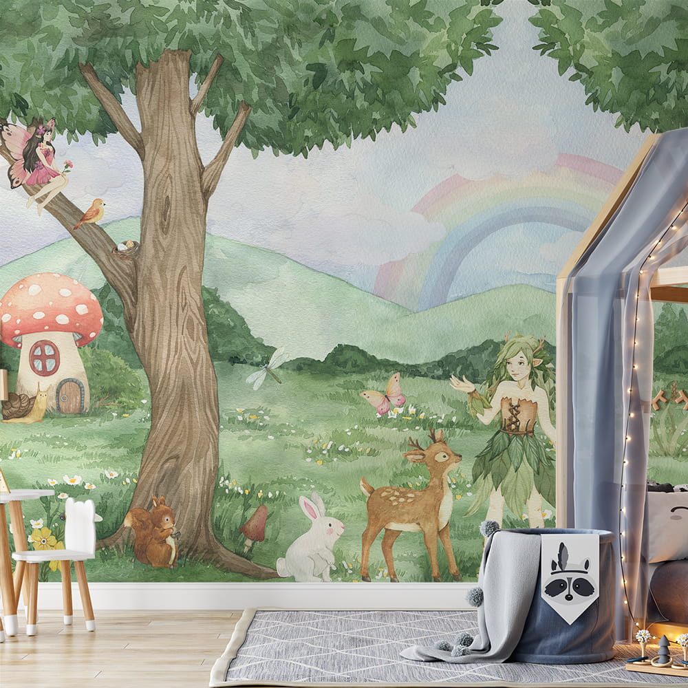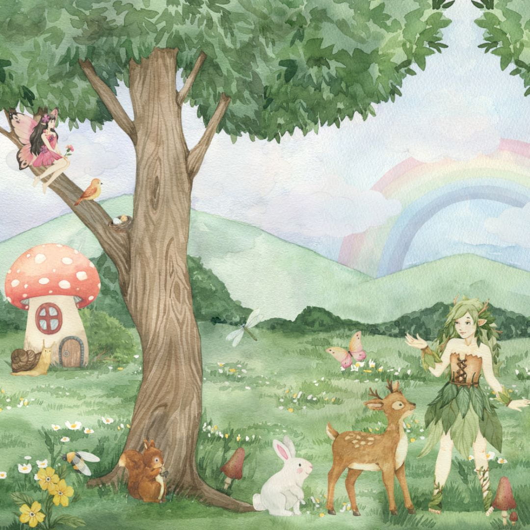 Tapeta Bajkowa Kraina to magiczne miejsce zamieszkałe przez najrozmaitsze stworzenia. Nieustraszona Driada oraz magiczna Wróżka czuwają nad spokojem tego miejsca. Na tej bajkowej tapecie do pokoju dziewczynki znajdziesz również sarenkę, króliczka, ślimaka i kilka innych zwierzaków. Mali mieszkańcy Bajkowej Krainy uwielbiają wspólnie spędzać czas. W takim towarzystwie nie może zabraknąć magii, kolorów i dobrego nastroju.
