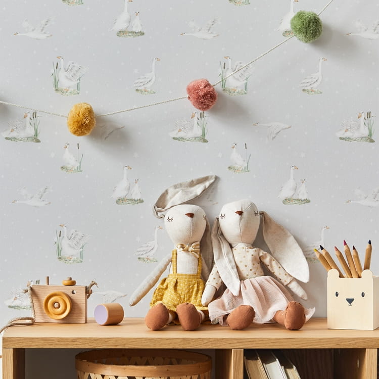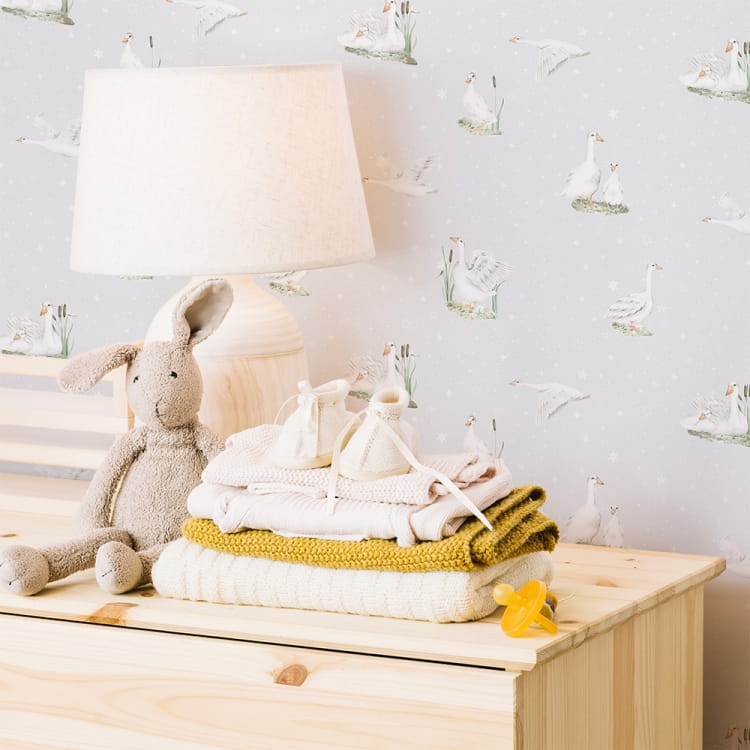 Tapeta winylowa o strukturze płótna z motywem gąsek na jasnoszarym tle z delikatnymi gwiazdkami.