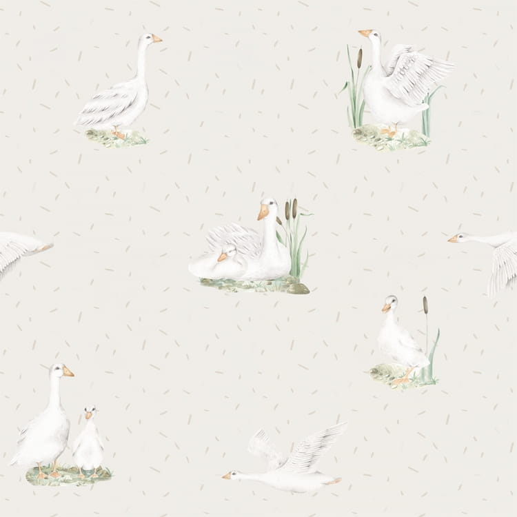 Tapeta winylowa o strukturze płótna z motywem gąsek na jasnobeżowym tle z drobnym wzorem.