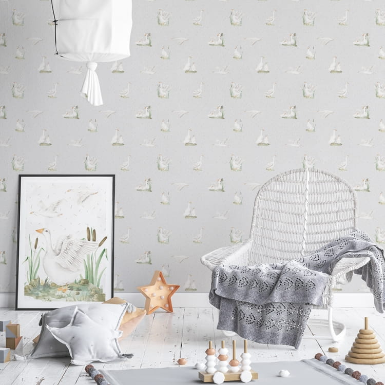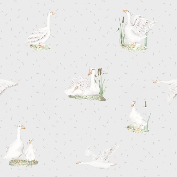 Tapeta winylowa o strukturze płótna z motywem gąsek na jasnoszarym tle z drobnym wzorem.