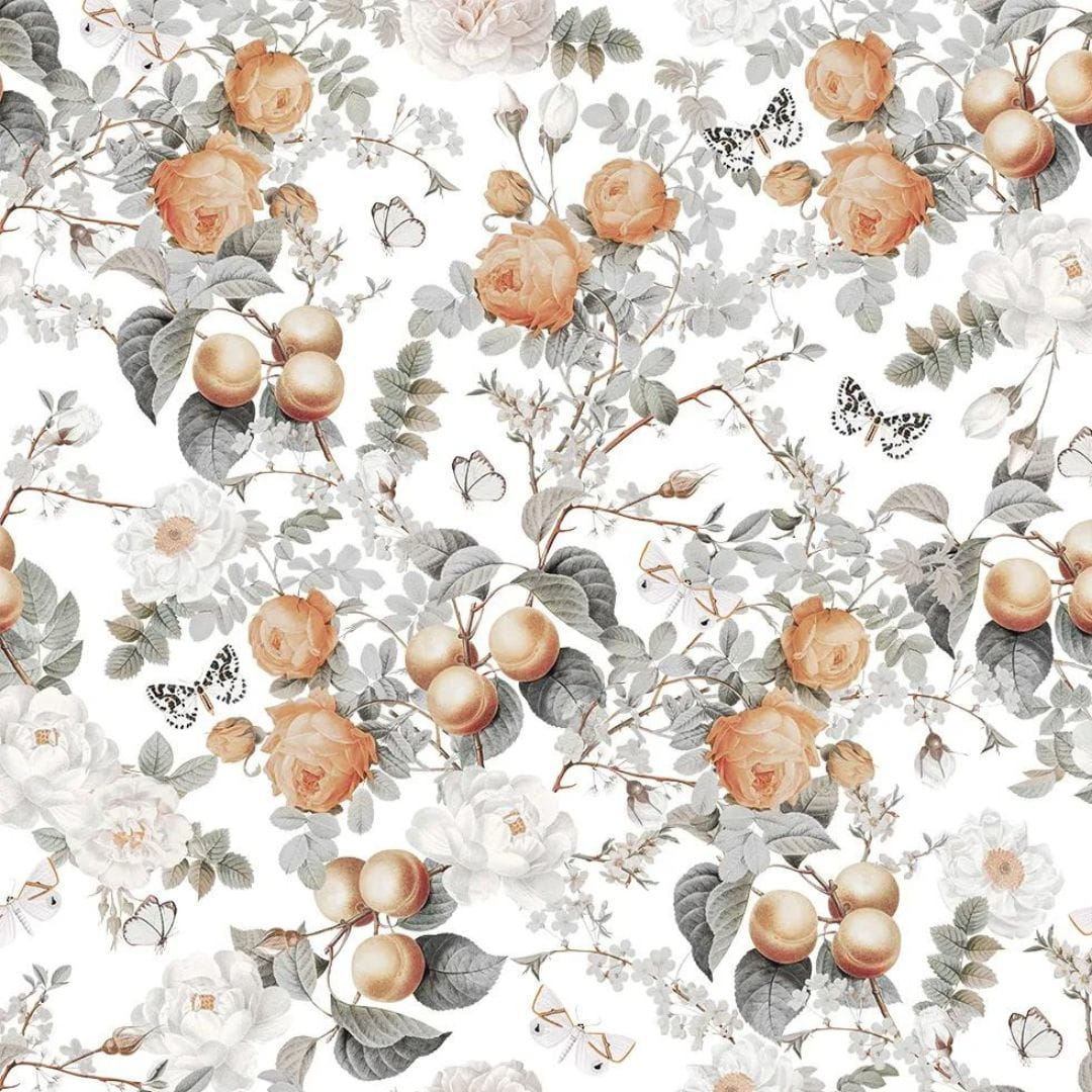 Tapeta do pokoju dziewczynki Kwiaty i Brzoskwinie w towarzystwie motyli na białym tle sprawdzi się zarówno w nowoczesnych wnętrzach, jak i tych w klimacie retro.