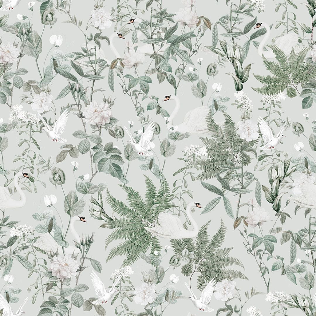 Tapeta do pokoju dziewczynki o stonowanych barwach i kojącym, sielskim wzorze to idealne rozwiązanie do pokoju malucha oraz starszej dziewczynki. Motywem przewodnim tapety YokoDesign jest bujna roślinność w kompozycji z białymi łabędziami i gołębiami na jasnym tle. Odcienie bieli i zieleni stanowią idealną bazę do wystroju każdego wnętrza.