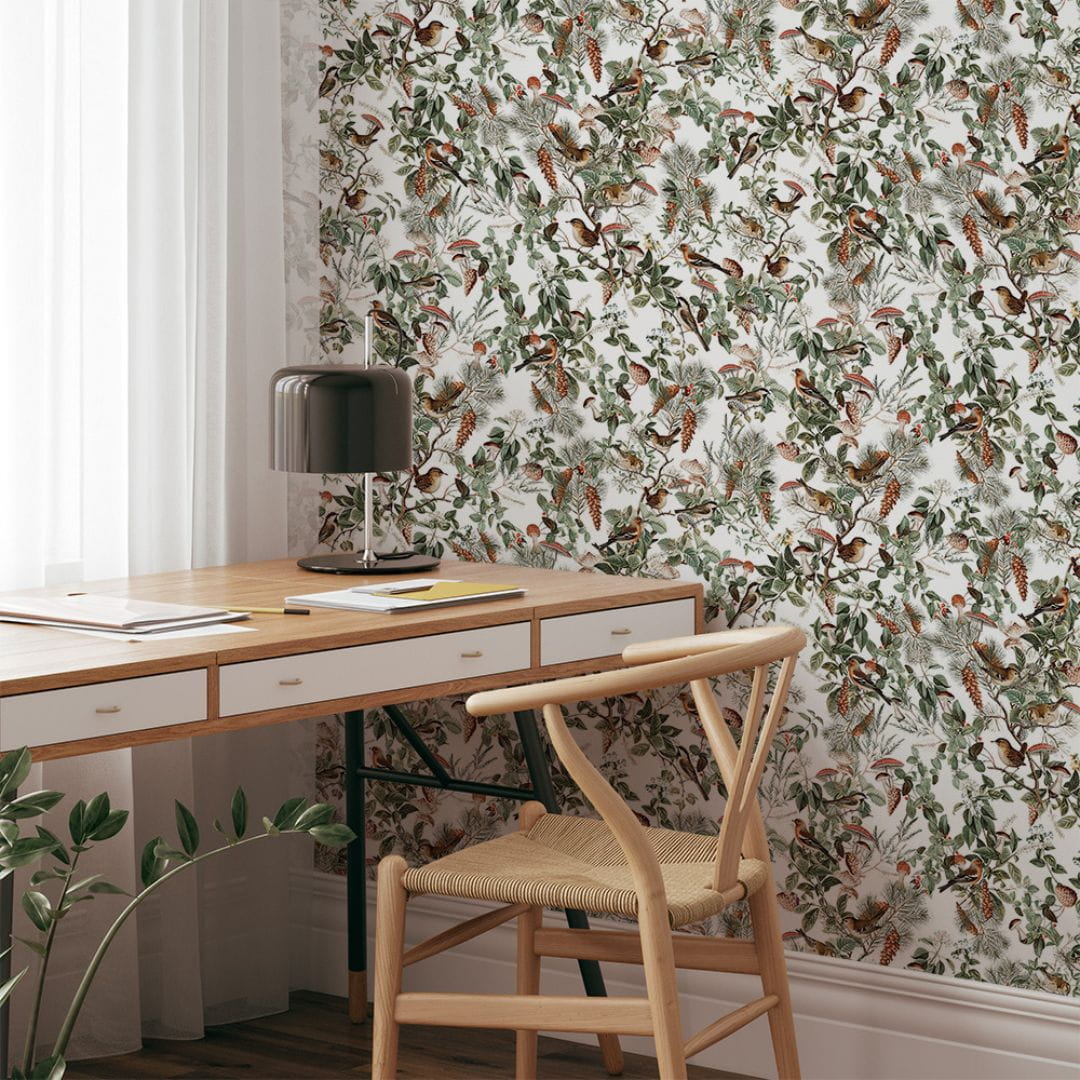 Wzór na tapcie leśnej przedstawia ptaki, szyszki, grzybki, fragmenty drzew iglastych oraz liściastych.