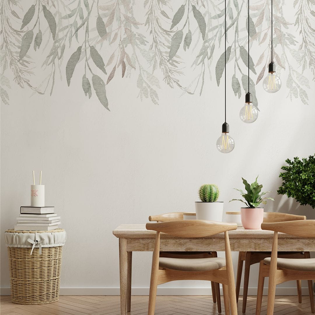 Tapeta winylowa na podkładzie flizelinowym z motywem botanicznym. Zielone gałązki ożywią wnętrze, a białe tło doda klasy i elegancji. Daj się oczarować pięknem natury i stwórz niepowtarzalną atmosferę w swoim domu!