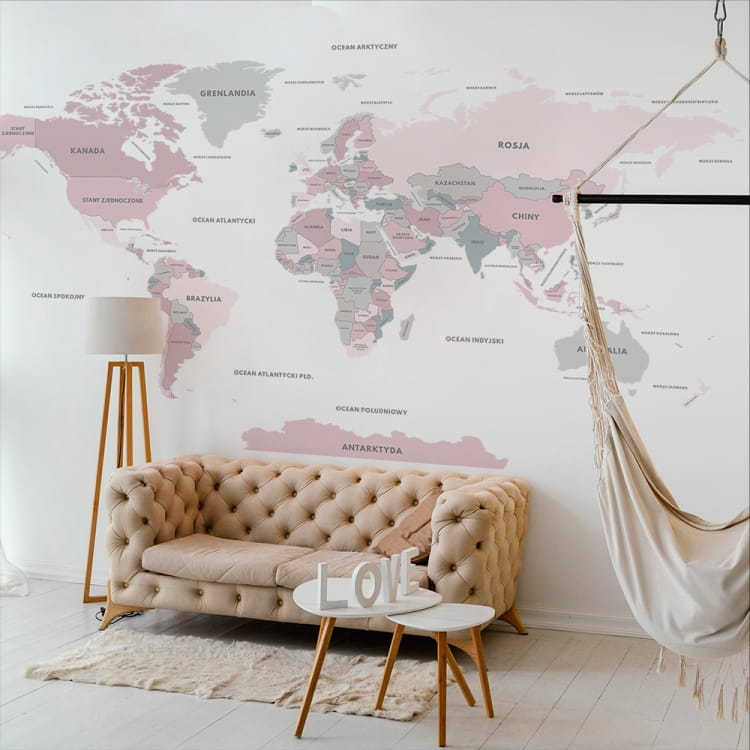 Różowa tapeta Mapa to nie tylko uniwersalna dekoracja, ale także możliwość codziennego obcowania z całym światem. Mapa posiada wyszczególnione kontury oraz nazwy państw, dzięki czemu mimowolnie możemy kodować, przypominać sobie albo po prostu poznawać wszystkie kraje naszego fantastycznego globu.