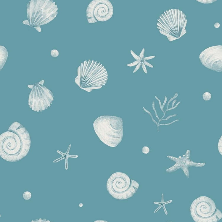 Tapeta dziecięca winylowa o strukturze płótna z motywem muszli na niebieskim tle.