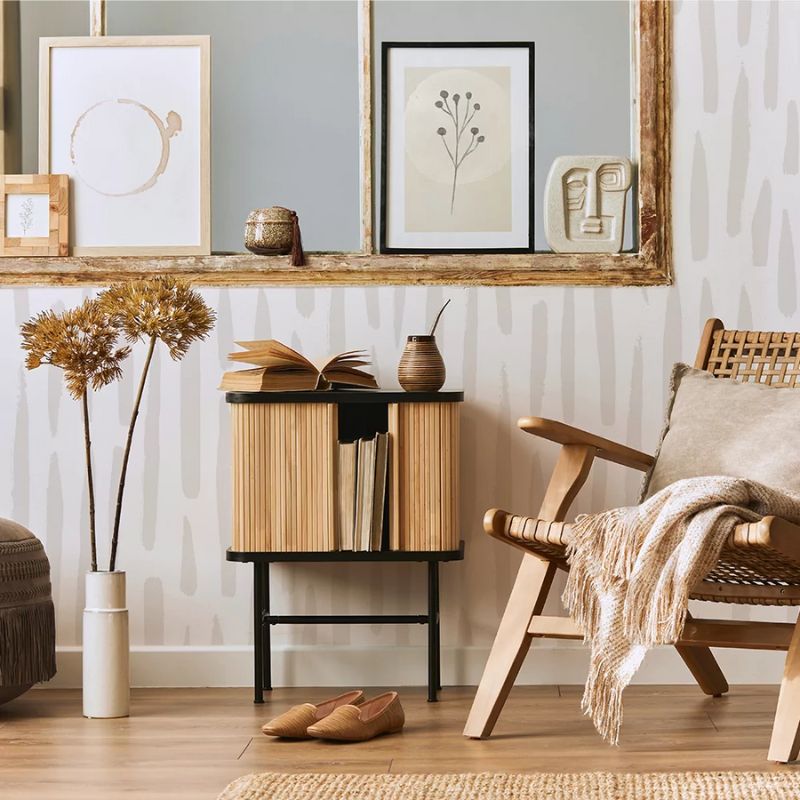 Powtarzalny wzór w stonowanych kolorach to propozycja dla miłośników minimalizmu i ponadczasowego designu.Jeśli chcesz zachować subtelny styl, to tapeta z nieregularnym wzorem pasków będzie pięknie komponować się w Twojej aranżacji.