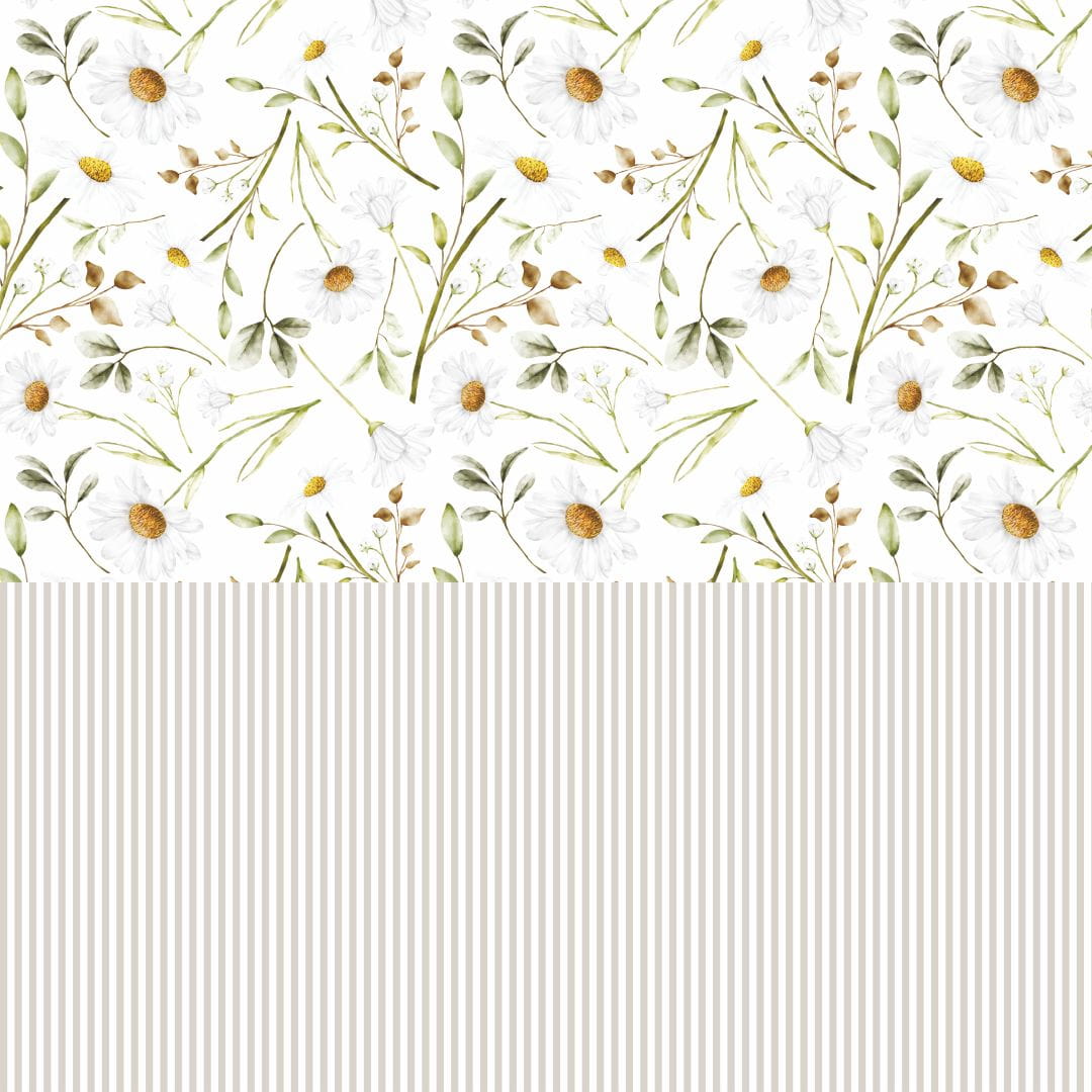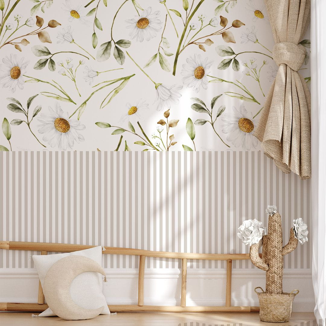 Tapeta winylowa na podkładzie flizelinowym w formie lamperii z kwitnącym rumiankiem w górnej części wzoru. To idealne połączenie kwiatowego wzoru i motywu lamperii, które spowoduje, że nawet małe pomieszczenie nie zostanie przytłoczone przez gęsty pattern. Ciepłe beże wprowadzą do wnętrza spokój, harmonię i nutę elegancji.