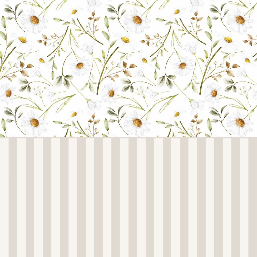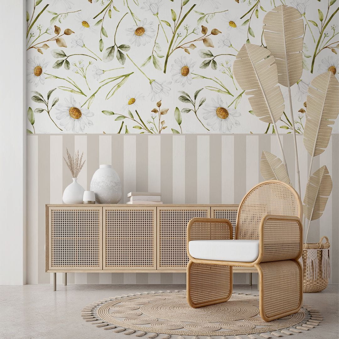 Tapeta winylowa na podkładzie flizelinowym w formie lamperii z kwitnącym rumiankiem w górnej części wzoru. To idealne połączenie kwiatowego wzoru i motywu lamperii, które spowoduje, że nawet małe pomieszczenie nie zostanie przytłoczone przez gęsty pattern. Ciepłe beże wprowadzą do wnętrza spokój, harmonię i nutę elegancji.