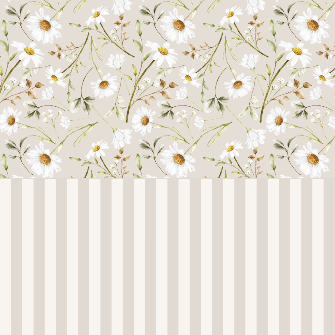 Tapeta winylowa na podkładzie flizelinowym w formie lamperii z kwitnącym rumiankiem w górnej części wzoru. To idealne połączenie kwiatowego wzoru i motywu lamperii, które spowoduje, że nawet małe pomieszczenie nie zostanie przytłoczone przez gęsty pattern. Ciepłe beże wprowadzą do wnętrza spokój, harmonię i nutę elegancji.