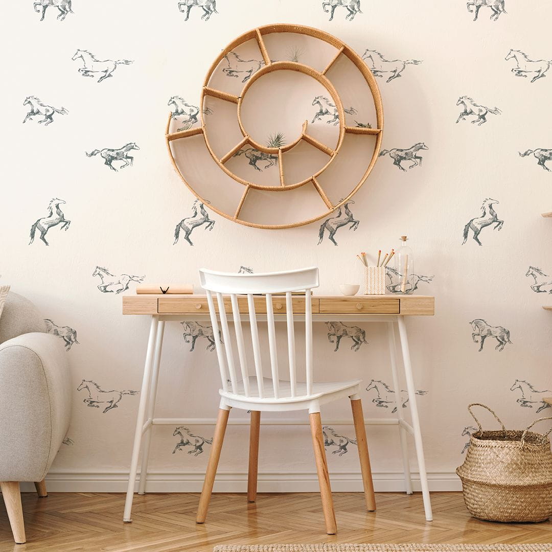 Tapeta winylowa na podkładzie flizelinowym z kolekcji Pencil drawn w kolorze beżowym. Delikatne szkice koni ożywią ściany pokoju najmłodszych, tworząc przytulną i przyjazną atmosferę.