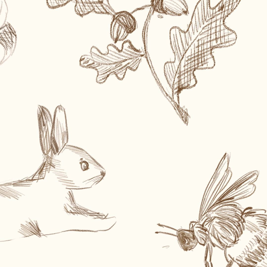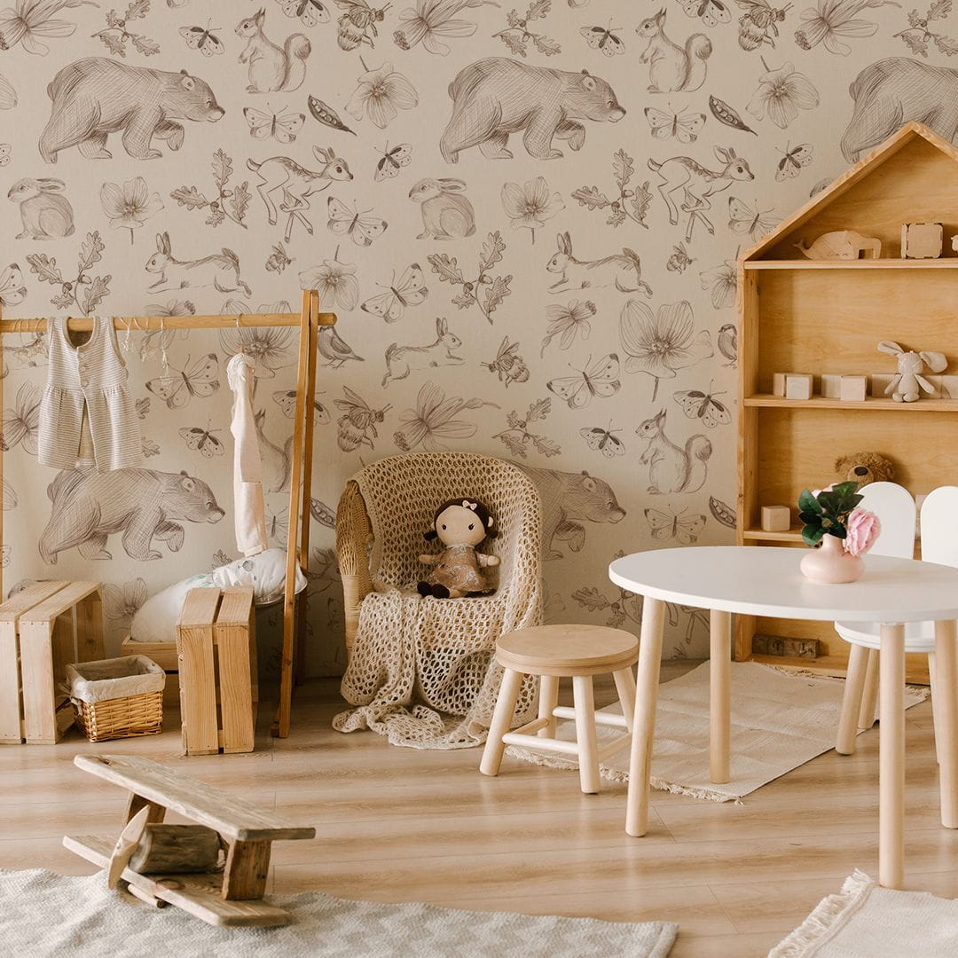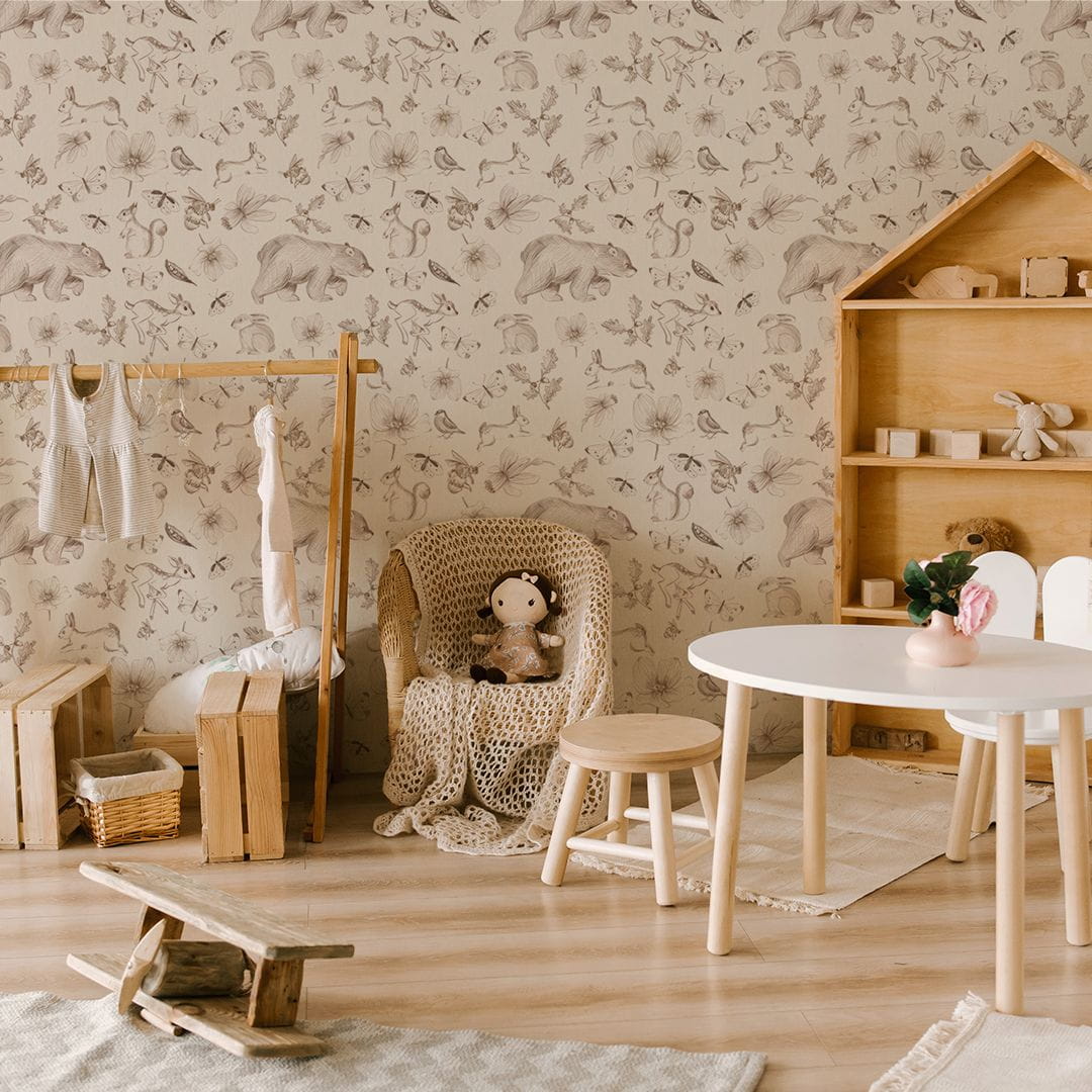 Tapeta winylowa na podkładzie flizelinowym z kolekcji Pencil drawn w kolorze beżowym. Delikatne szkice zwierząt leśnych ożywią ściany pokoju najmłodszych, tworząc przytulną i przyjazną atmosferę.