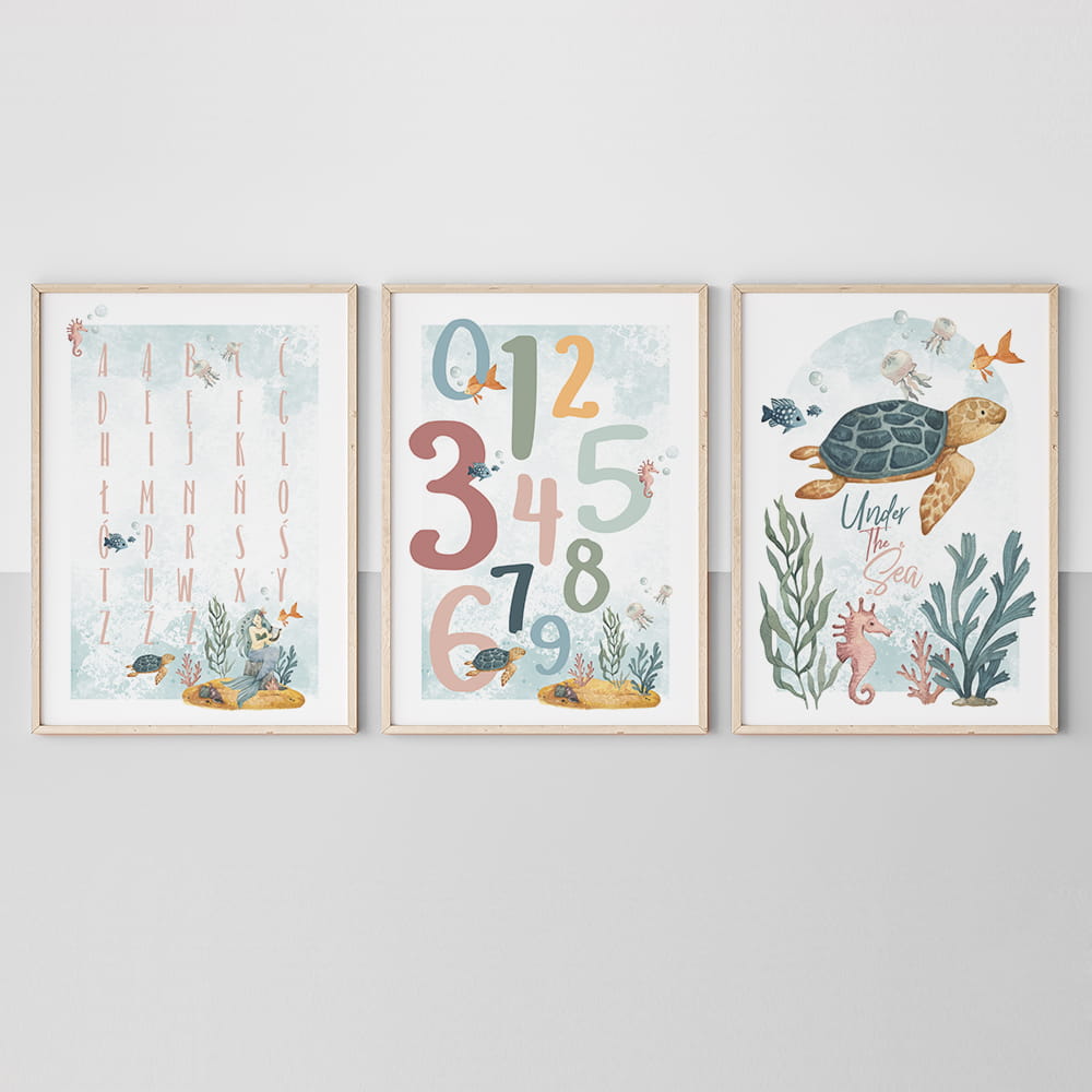 YOKO DESIGN - ZESTAW 3 PLAKATY PODWODNY ŚWIAT ŻÓŁW ALFABET CYFRY