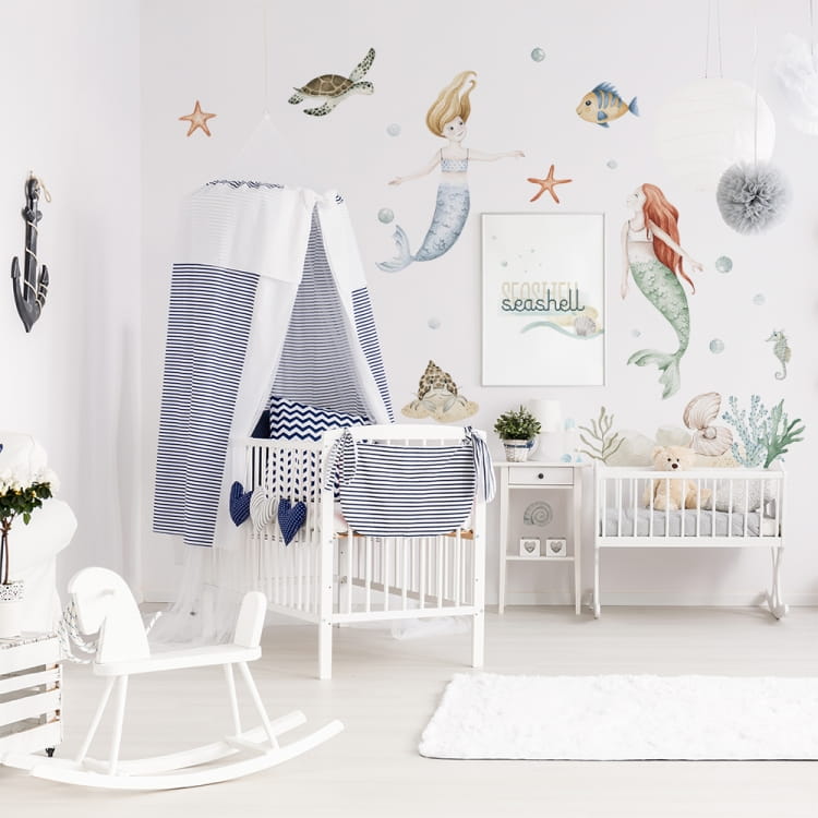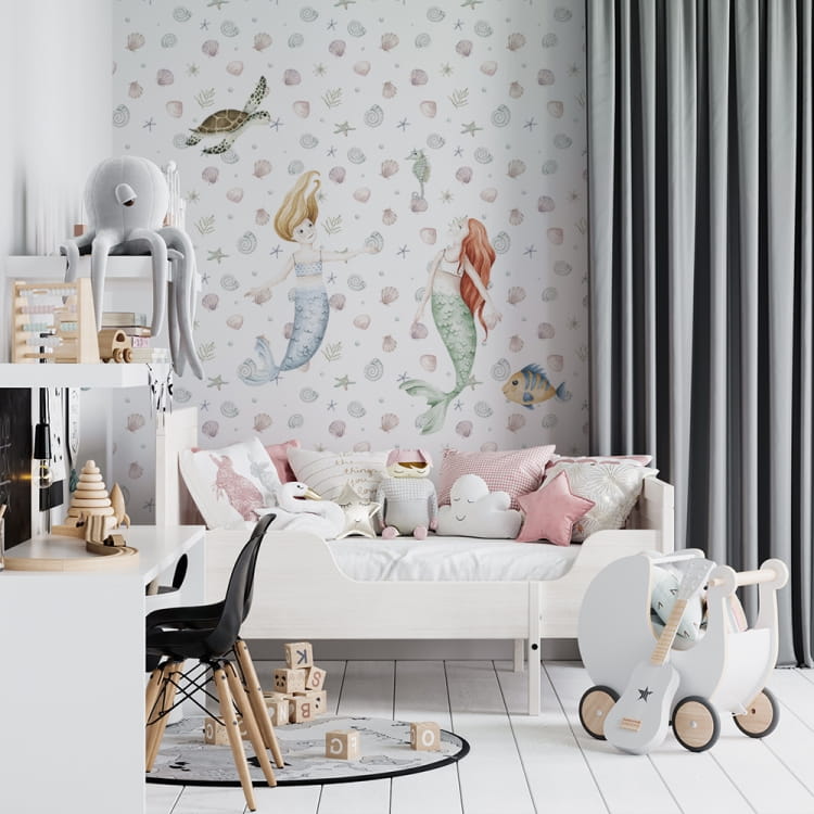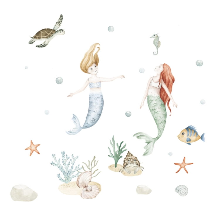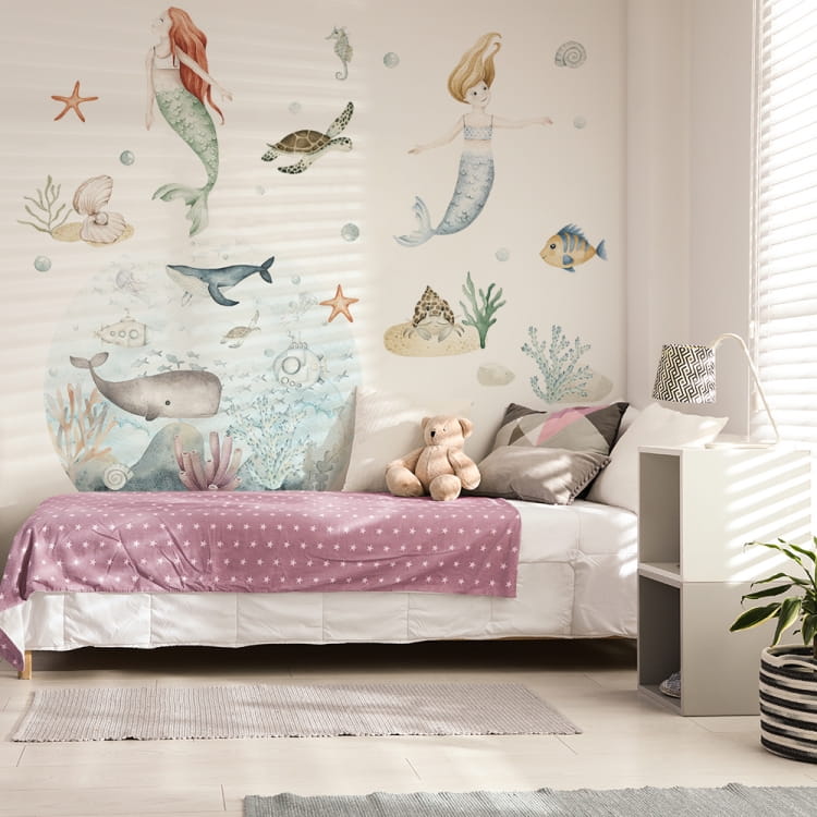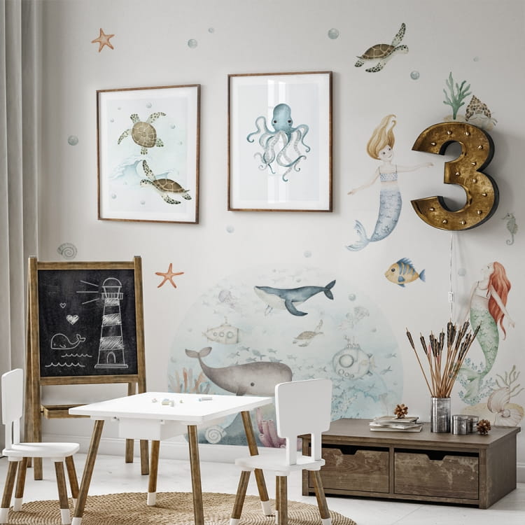 Prezentowane naklejki do pokoju dziewczynki to przepiękna sceneria z syrenkami, bawiącymi się w towarzystwie swoich przyjaciół. Oprócz syrenek znajdziecie tu rybkę, żółwia, rozgwiazdę oraz szereg dodatków, dzięki którym przeniesiesz swoje dziecko w tajemniczy świat oceanu.