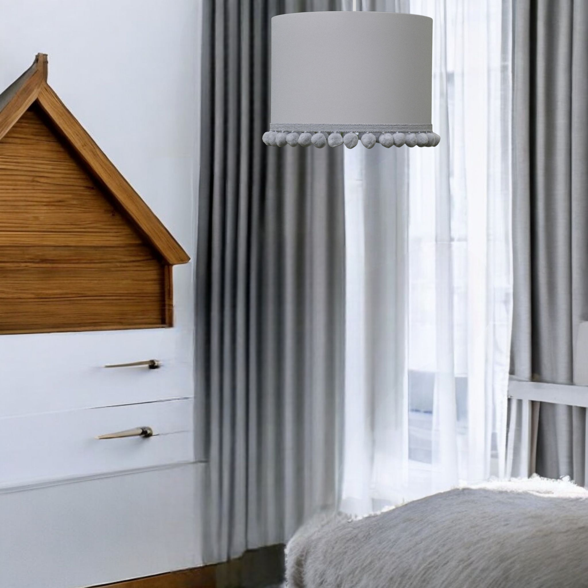 Szara lampa sufitowa mini z pomponami – subtelne światło do pokoju dziecka