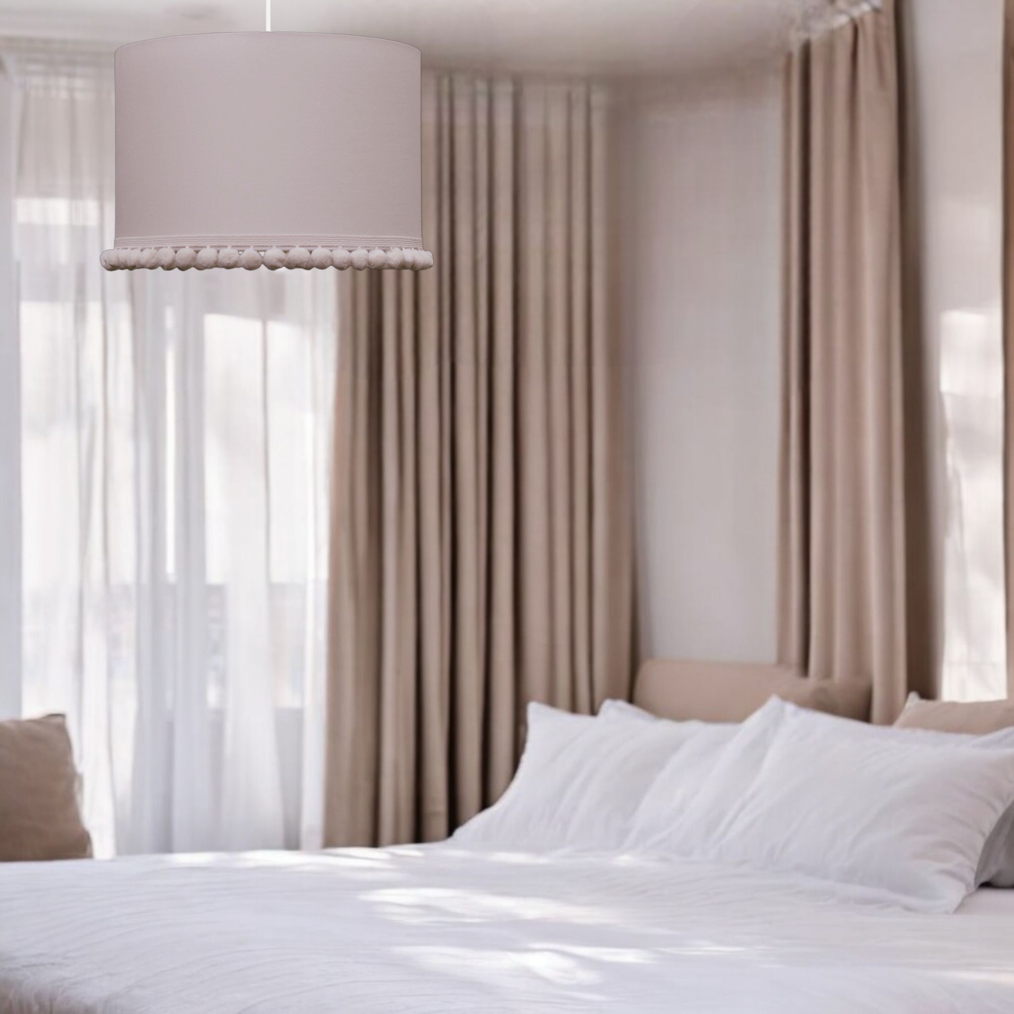 Beżowa lampa sufitowa z pomponami to uroczy akcent oświetleniowy, który wprowadzi do dziecięcego pokoju przytulny klimat i delikatny, dziewczęcy charakter. Wykonana z wysokiej jakości tkaniny w delikatnym odcieniu beżu, ozdobiona została subtelnym wykończeniem w postaci białych pomponów u dołu abażura. Ten drobny detal dodaje lampie lekkości i stylu vintage, doskonale wpisując się w aranżacje w stylu boho, retro, czy klasycznym.