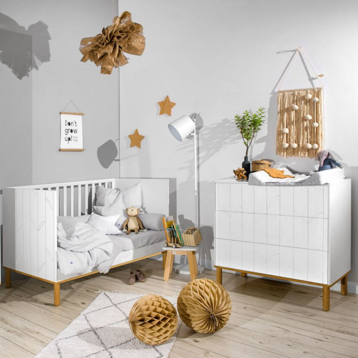 Zestaw mebli do pokoju dziecięcego Bellamy z kolekcji Toteme Botanic: łóżeczko z funkcją tapczanika i komoda z przewijakiem w promocyjnej cenie!