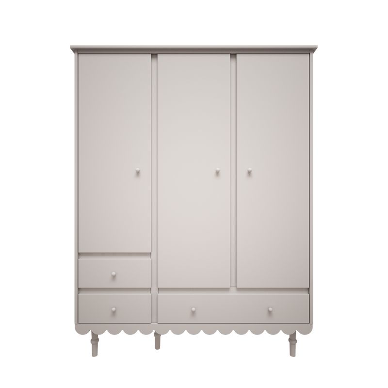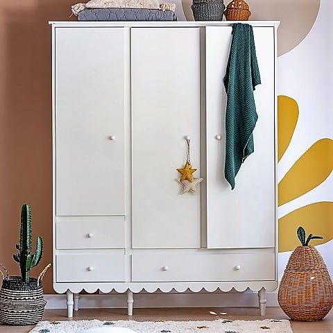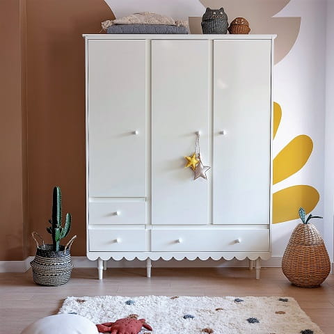Przestronna i funkcjonalna szafa to niezbędny element dziecięcego pokoju. Model Babushka oferuje przemyślaną organizację przechowywania: szeroki drążek na wieszaki, kilka pojemnych półek oraz trzy dolne szuflady. Dzięki temu pomieści nie tylko ubrania, ale też dodatki, akcesoria sezonowe czy pudełka z pamiątkami.