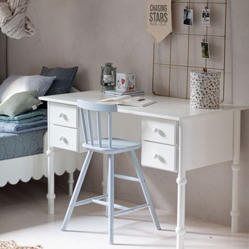 Stabilna konstrukcja i zaokrąglone krawędzie zwiększają bezpieczeństwo użytkowania, a białe, satynowe wykończenie nadaje meblowi lekkości i subtelnego uroku. To biurko, które świetnie sprawdzi się przez wiele lat – od pierwszych szkolnych dni aż po czas nastoletni.