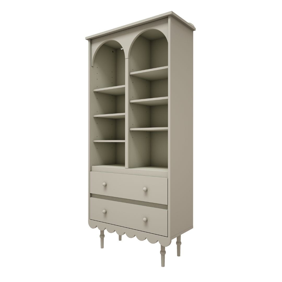 Wysoki regał z otwartymi półkami i szufladami to idealne rozwiązanie do przechowywania książek, dekoracji czy gier planszowych. Oliwkowy kolor wprowadza do pokoju dziecka naturalny, spokojny klimat, a starannie wykończone detale podkreślają estetykę retro. Regał świetnie komponuje się z pozostałymi elementami zestawu, tworząc spójną aranżację.