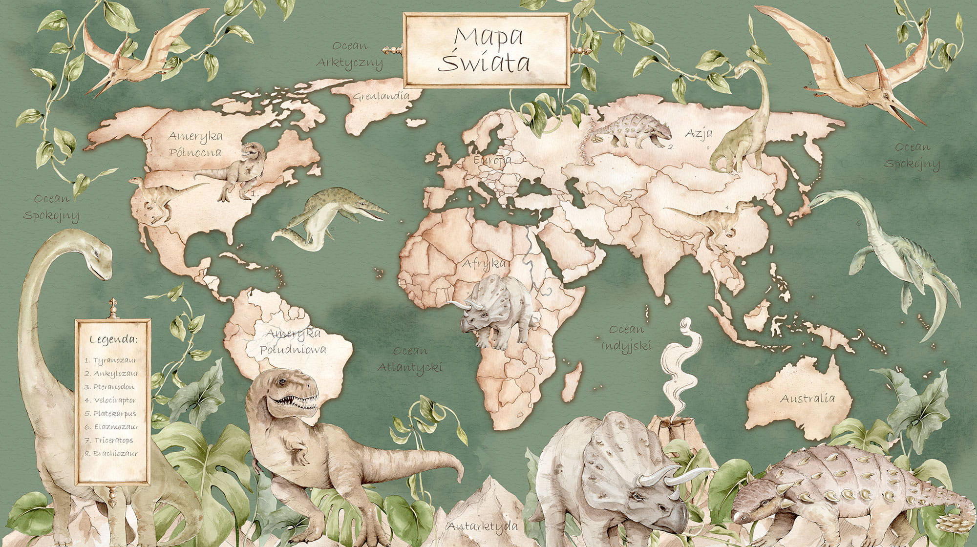 DEKORILLO MURAL MAPA ŚWIATA DINOZAURY ZIELONA - PRÓBKA TAPETY