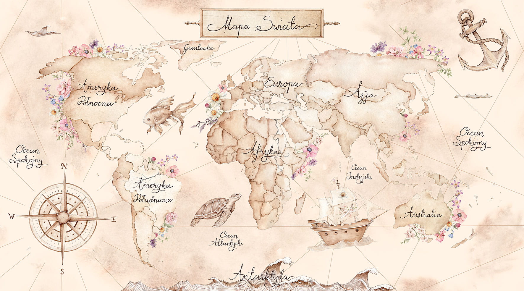 DEKORILLO MURAL MAPA ŚWIATA MORSKA BEŻOWA - PRÓBKA TAPETY