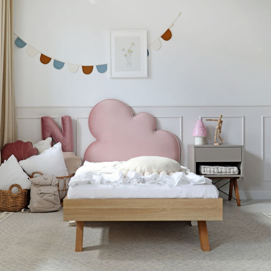 To rozwiązanie, które łączy w sobie funkcję wygodnego mebla do spania z niezwykle efektowną dekoracją. Zagłówek takiego łóżka, wykonany w kształcie miękkiej, puszystej chmury, nie tylko wygląda bajkowo, ale pełni też bardzo praktyczną rolę. Jest idealnym oparciem podczas wieczornego czytania książeczek, a dzięki miękkiemu wypełnieniu chroni malucha przed uderzeniem o ścianę podczas snu.